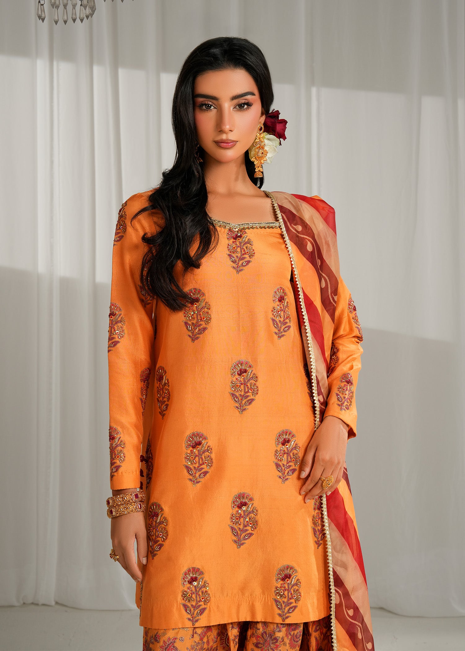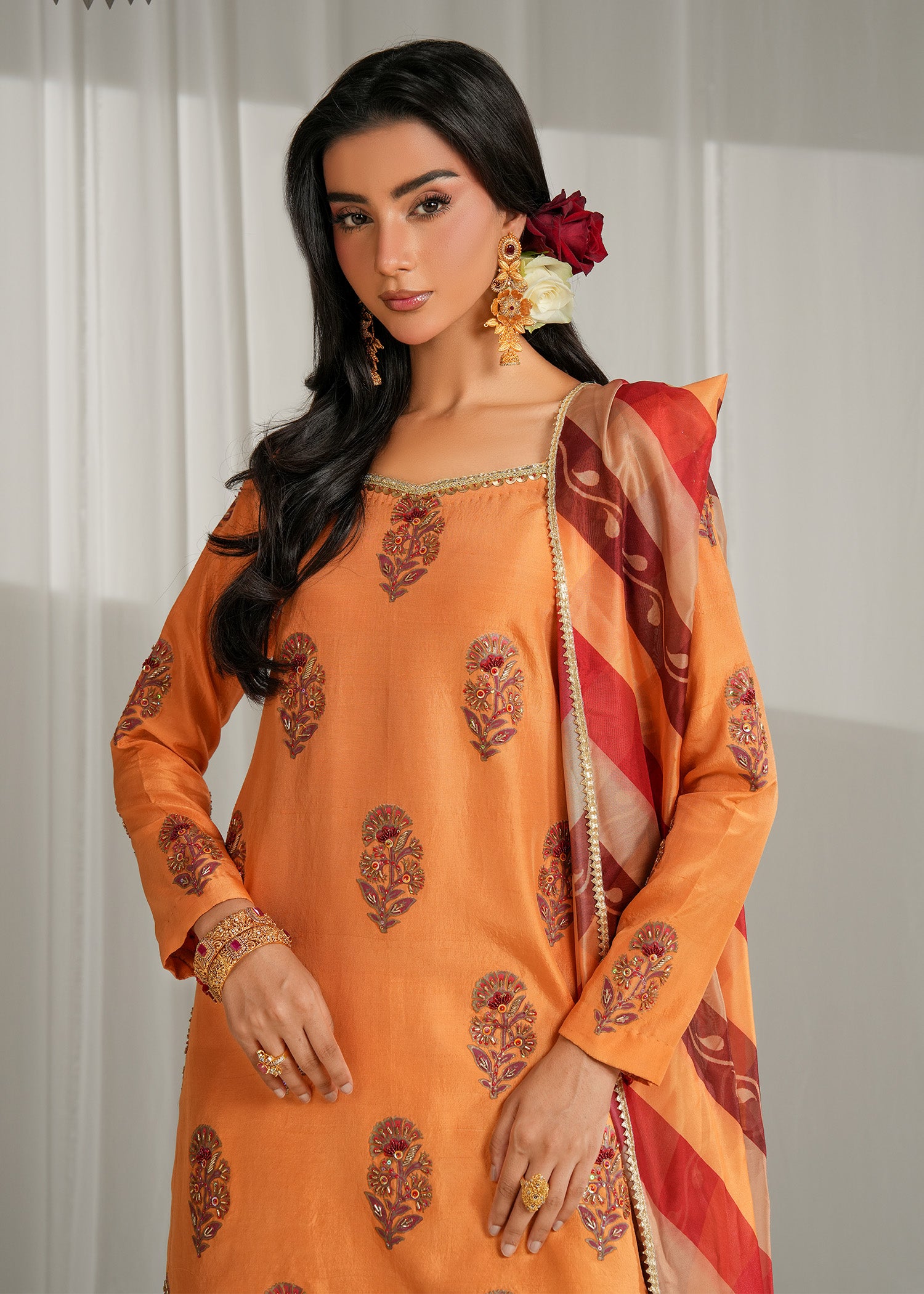 The Amber Haze Dress features a beautifully block-printed raw silk shirt and shalwar, enhanced with delicate hand embellishments for a touch of elegance. Paired with a luxurious silk printed dupatta, this ensemble perfectly blends tradition with timeless sophistication.