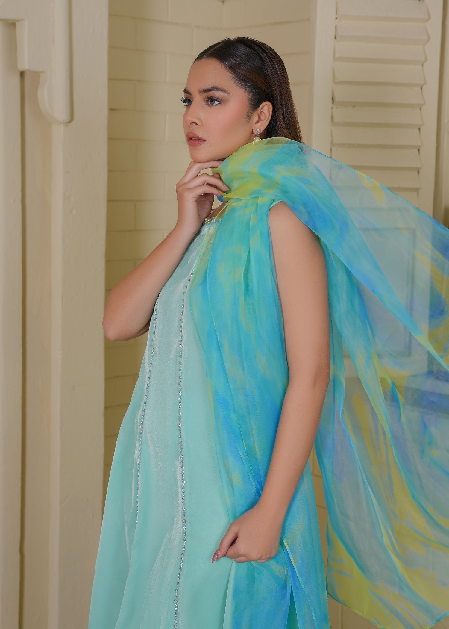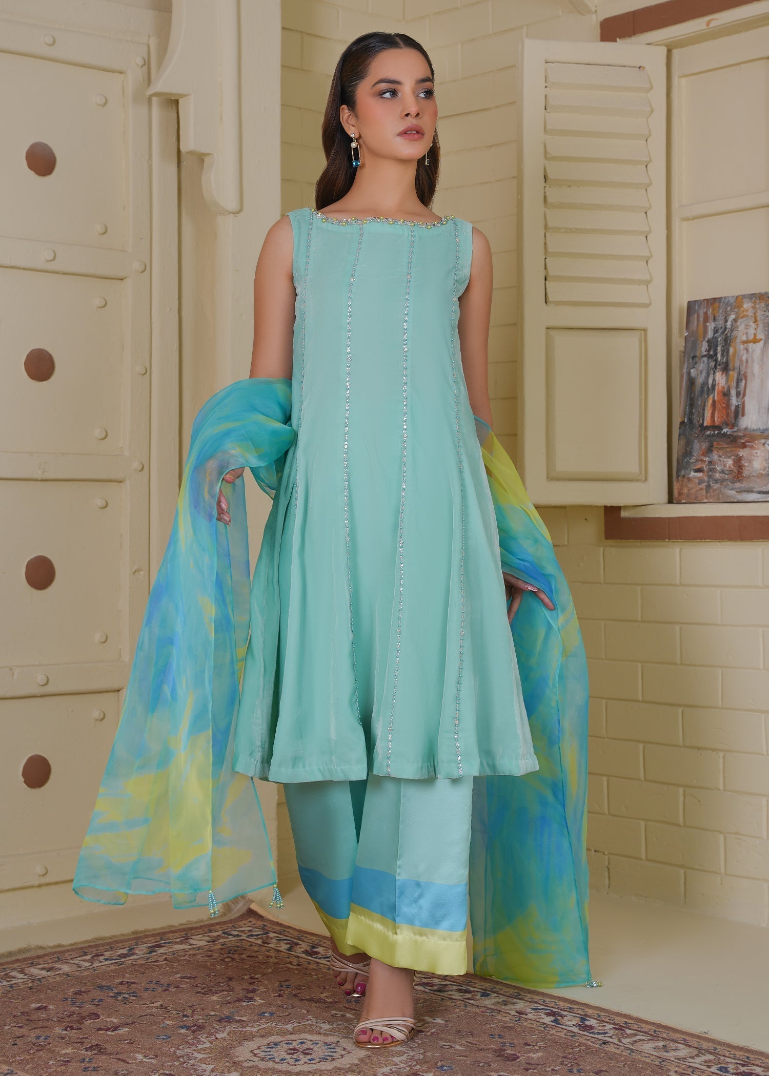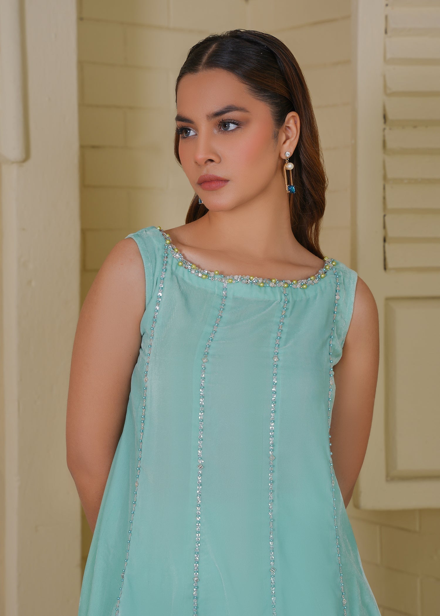 Aqua Velvet Ensemble: A luxurious sea-green velvet dress paired with exquisite detailing, radiating elegance and sophistication. The rich velvet texture, combined with subtle.