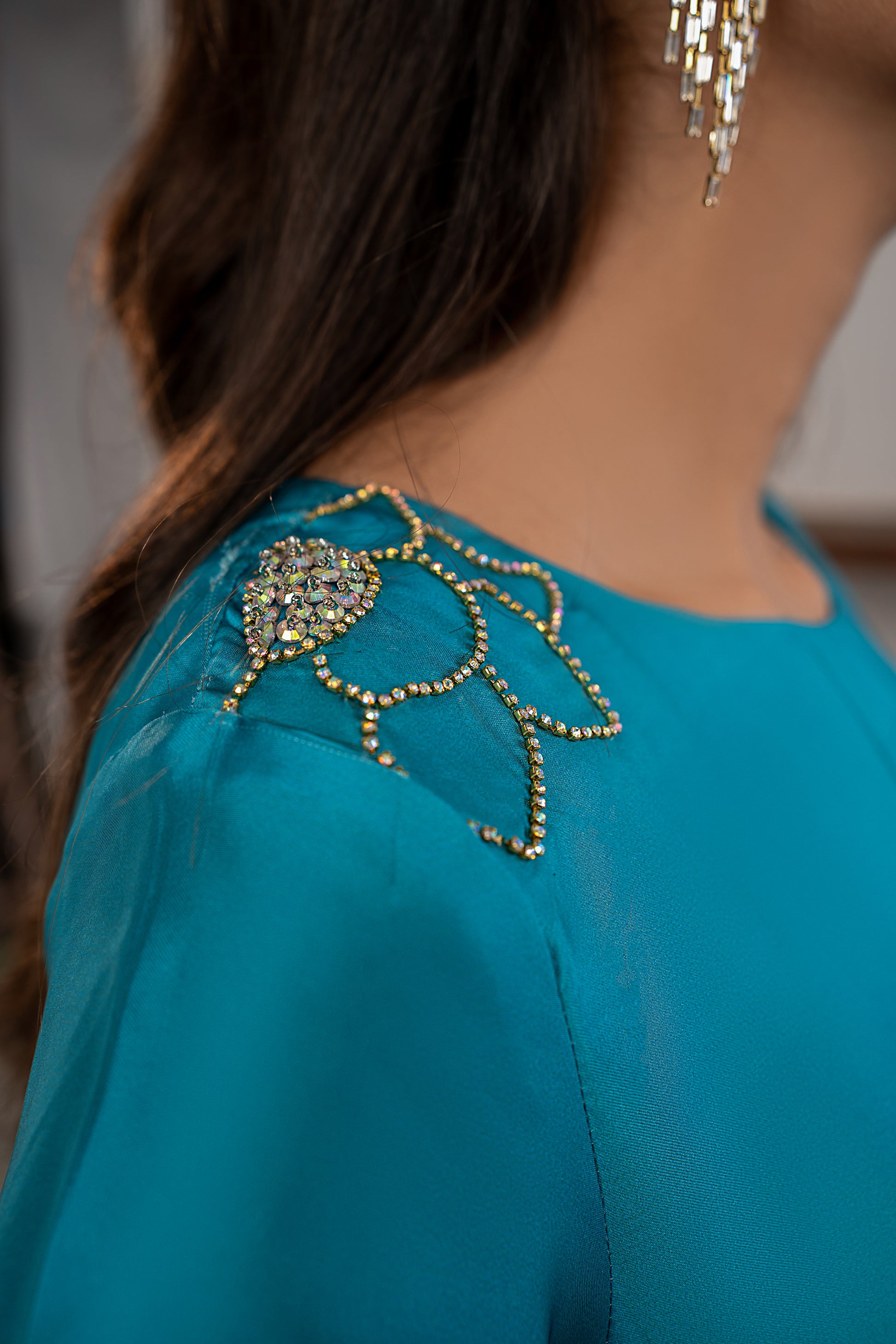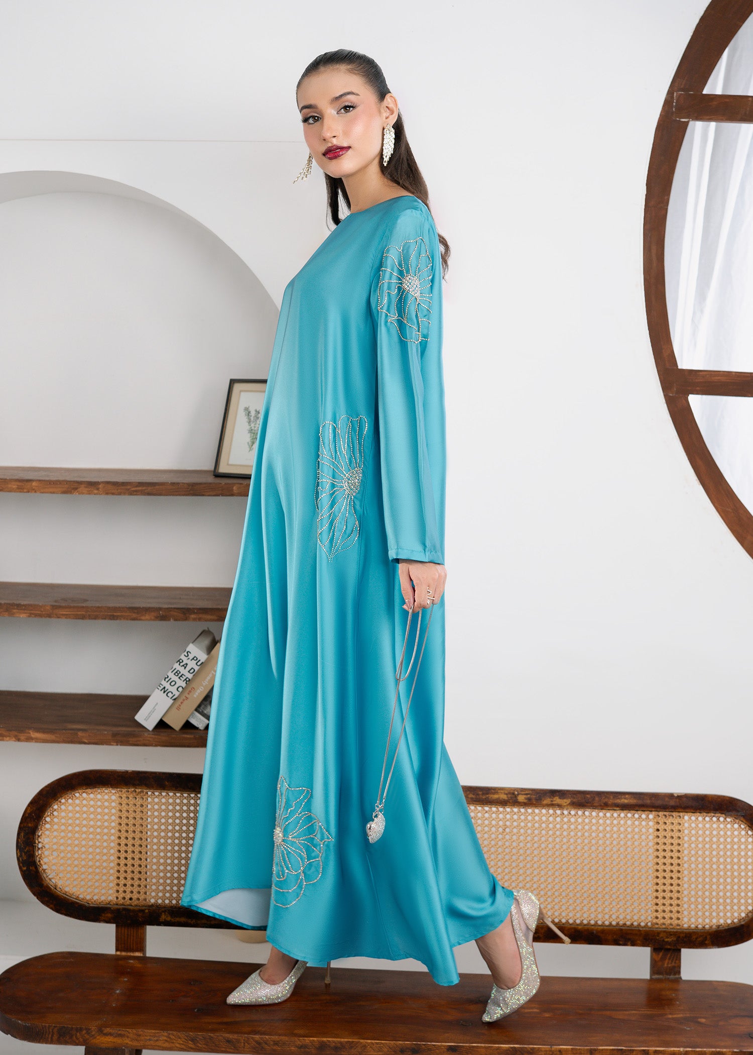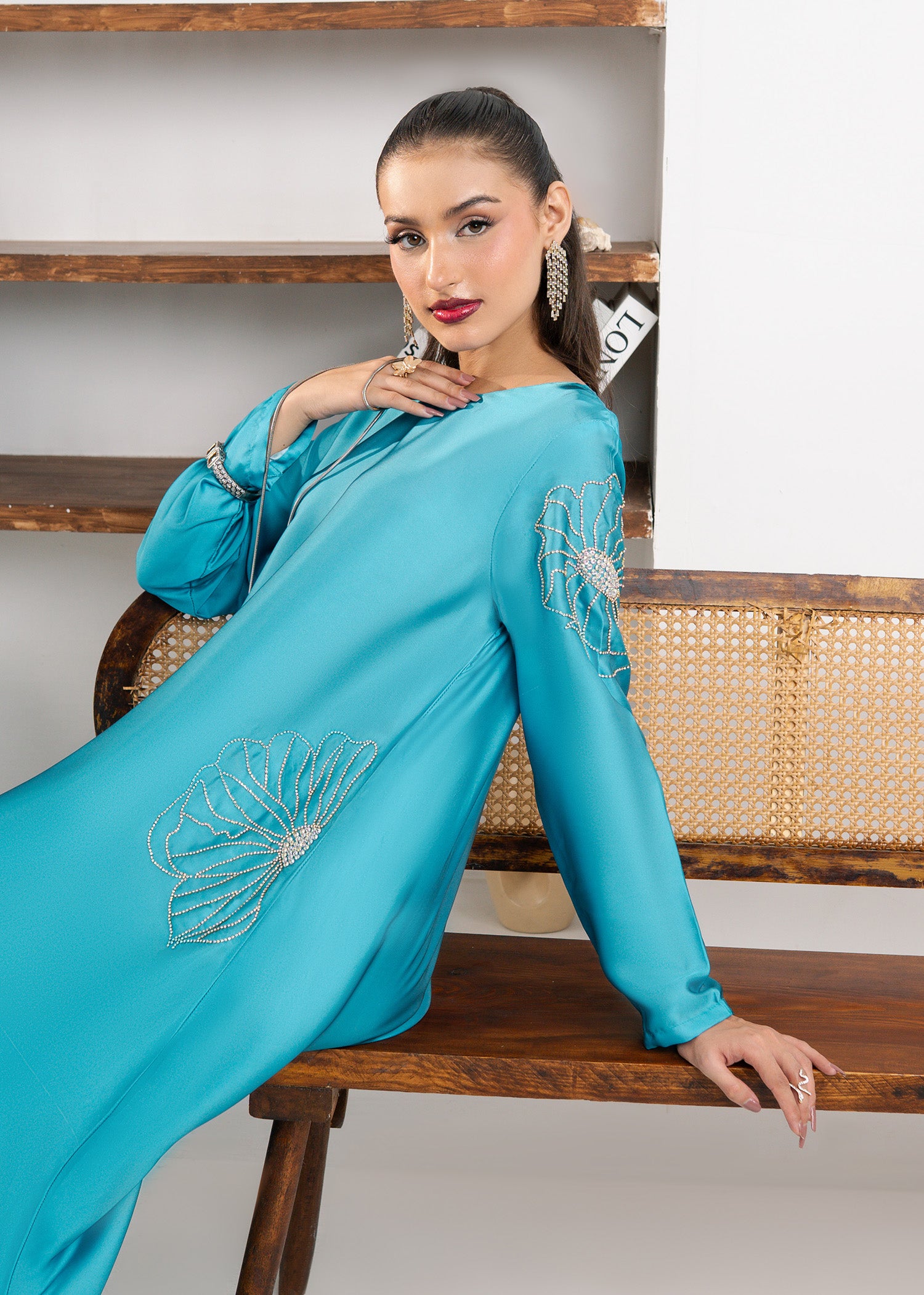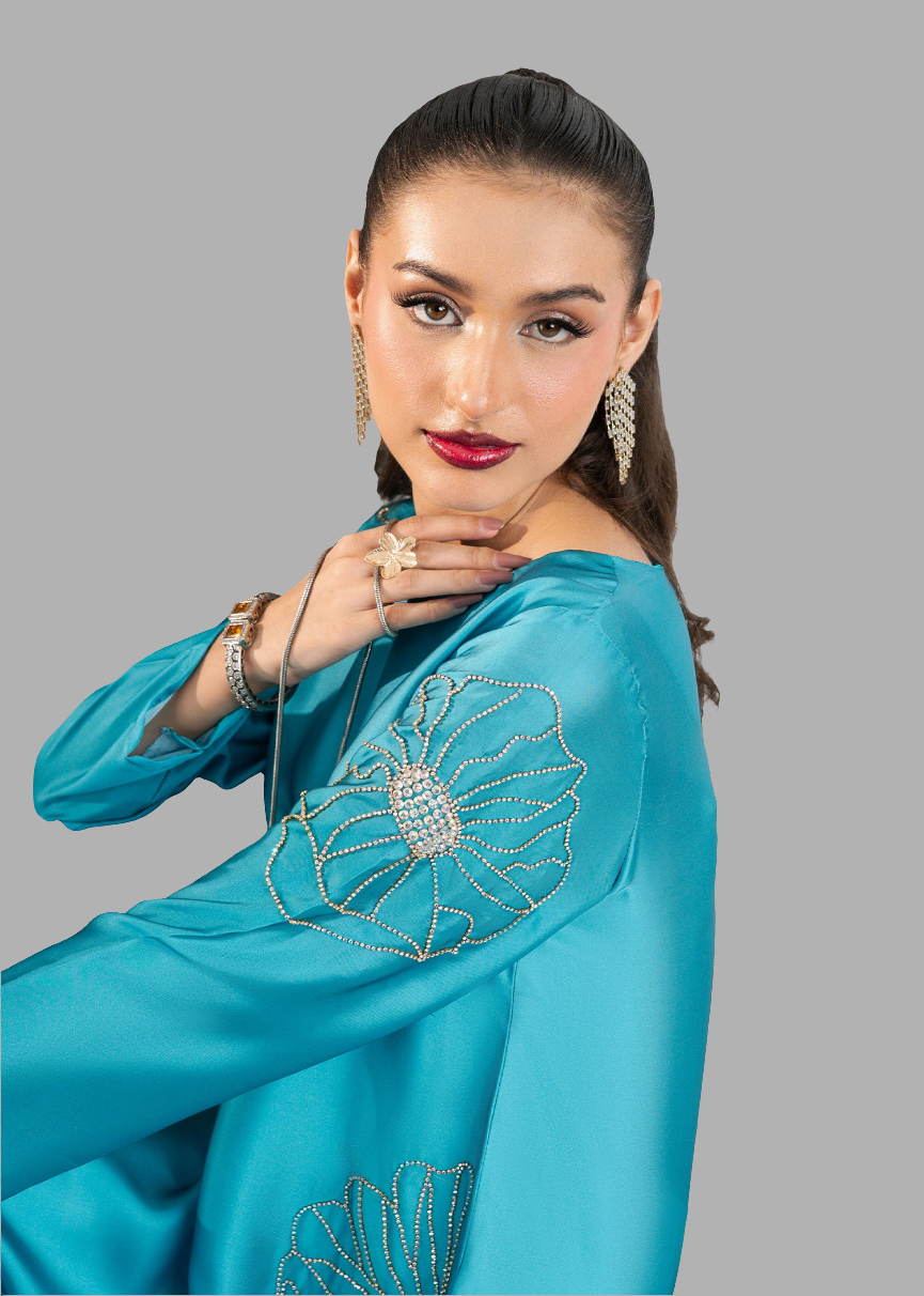 Radiate freshness with our Aqua Bloom Silk Shirt, a stunning piece crafted from premium silk fabric. The serene ferozi (aqua) hue beautifully complements the delicate flower motif embellishments, adding a touch of elegance and charm. With its smooth, lustrous finish and refined detailing, this shirt is perfect for festive gatherings or semi-formal occasions. Pair it with white or pastel trousers for a graceful, effortlessly chic look.