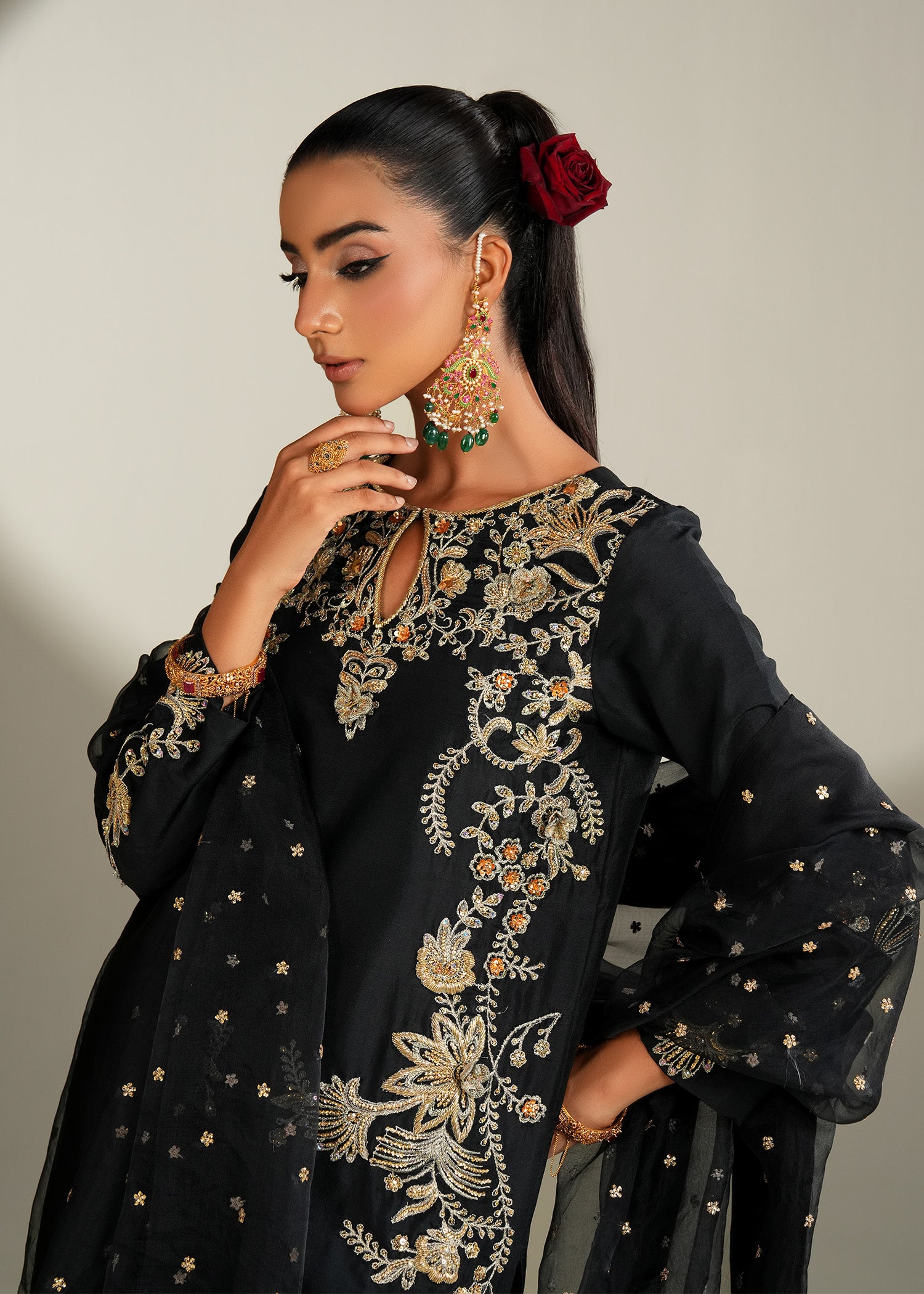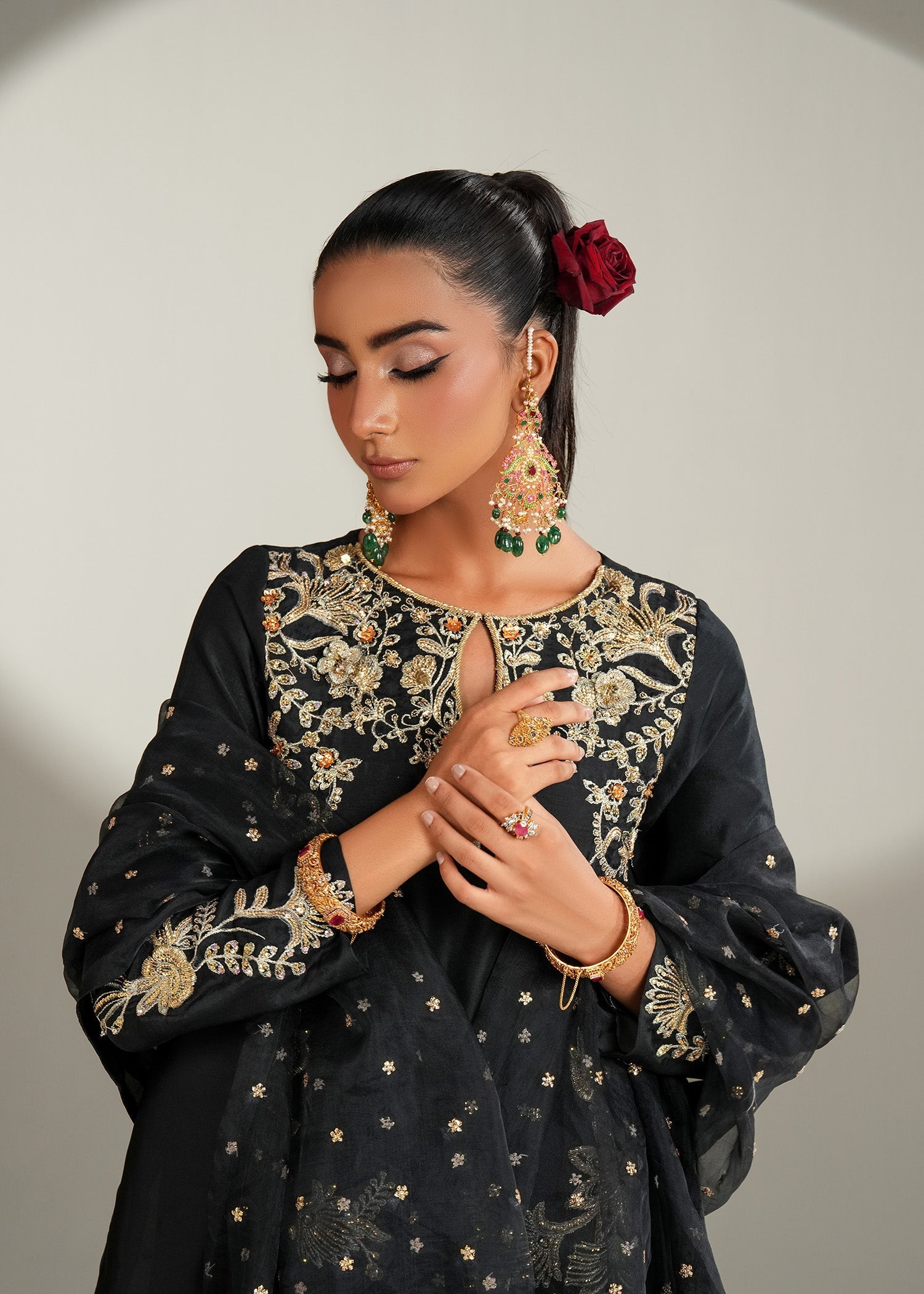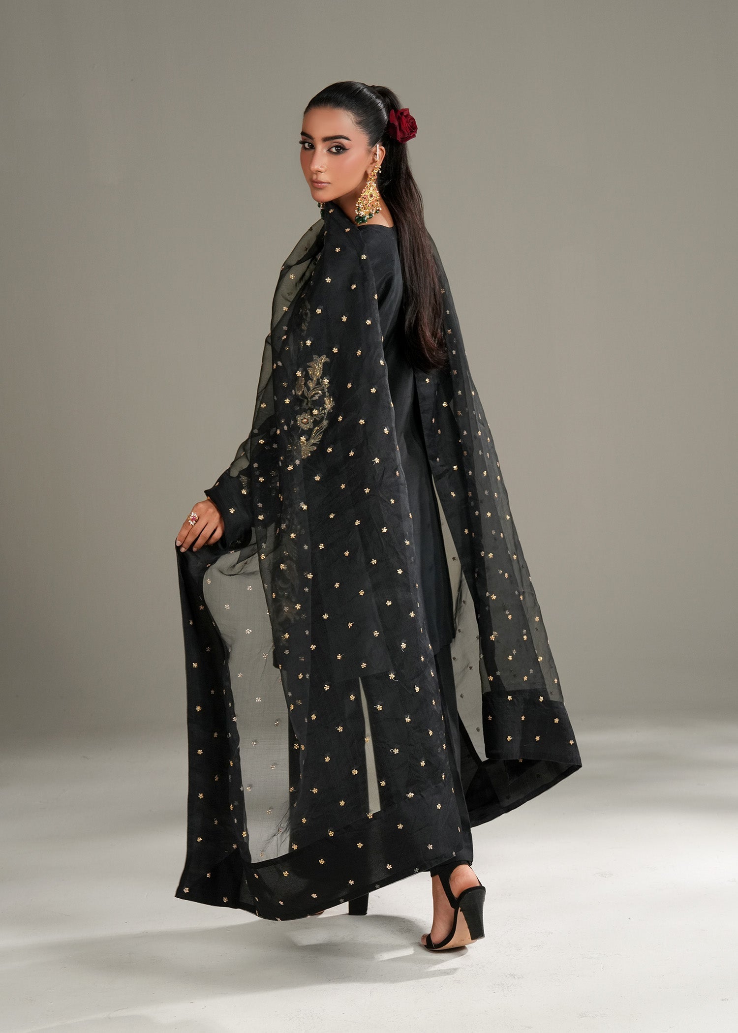 The Black Swan Dress features a luxurious raw silk shirt and trouser, beautifully adorned with delicate gold embellishments. Paired with a graceful organza dupatta highlighted with shimmering gold sequins, this ensemble exudes timeless elegance and sophistication.