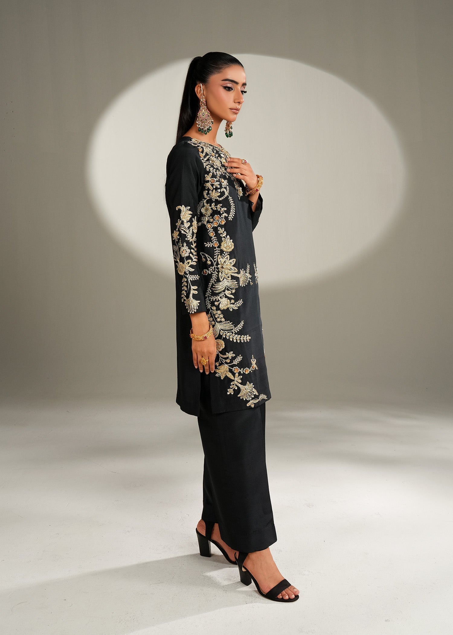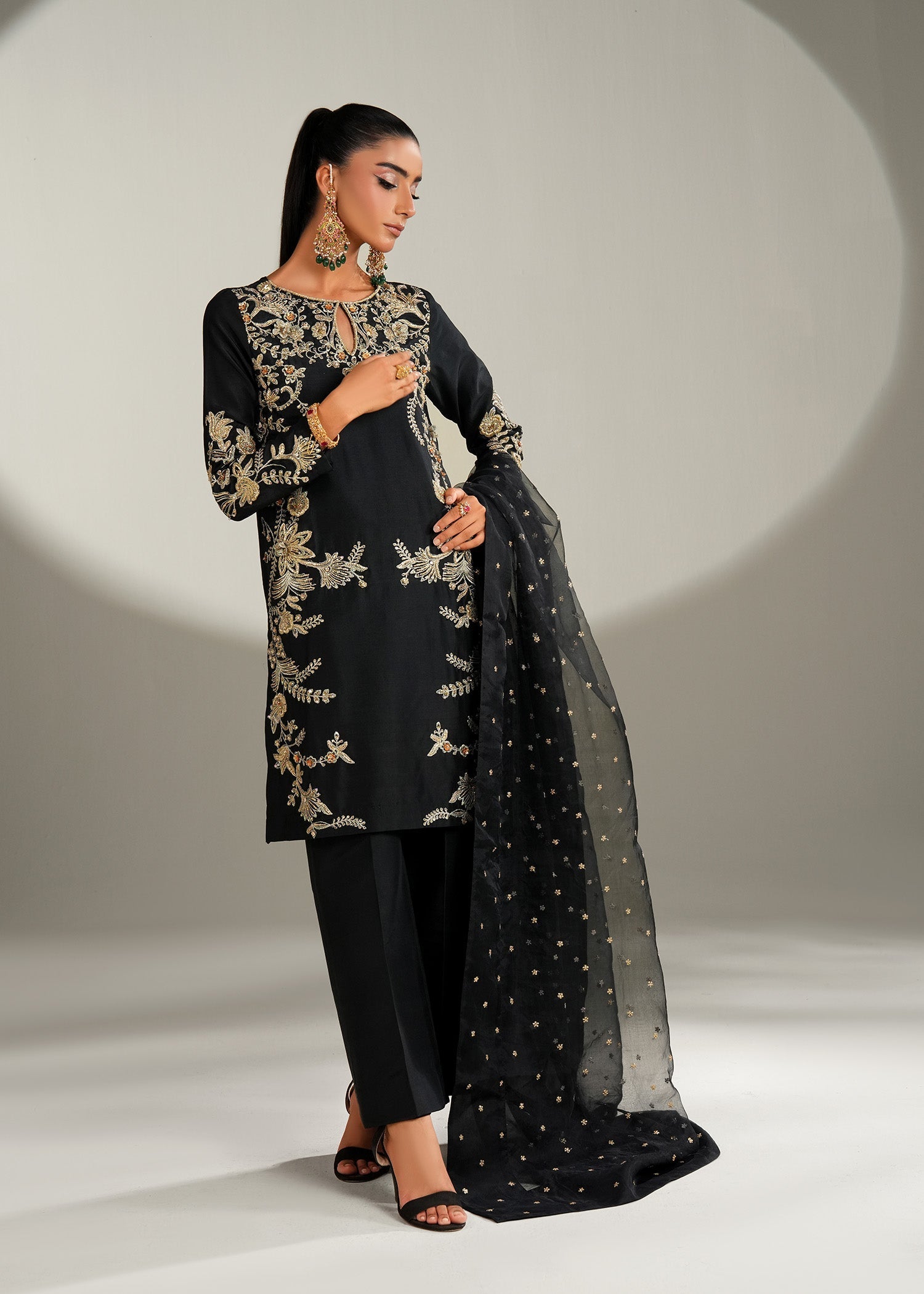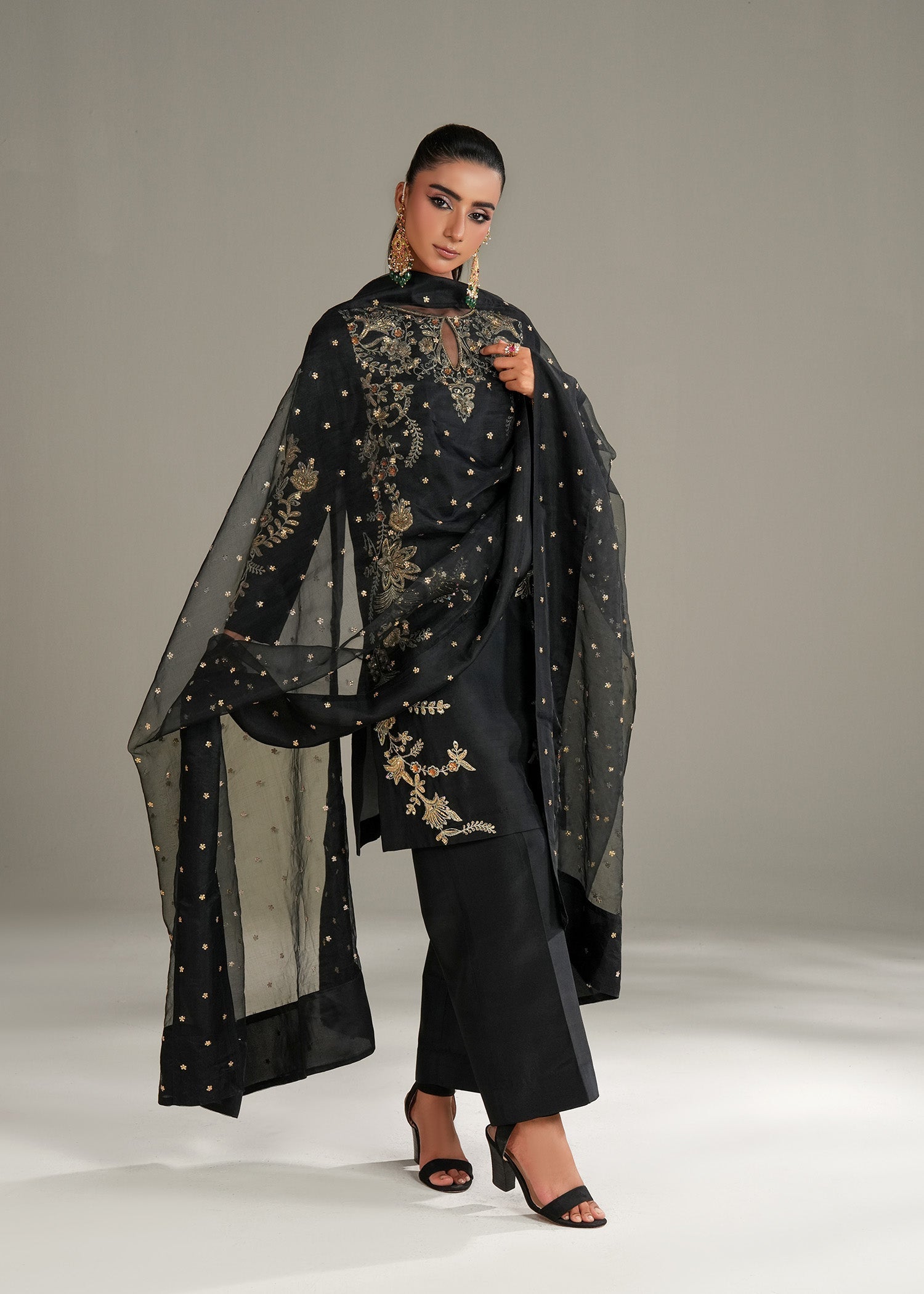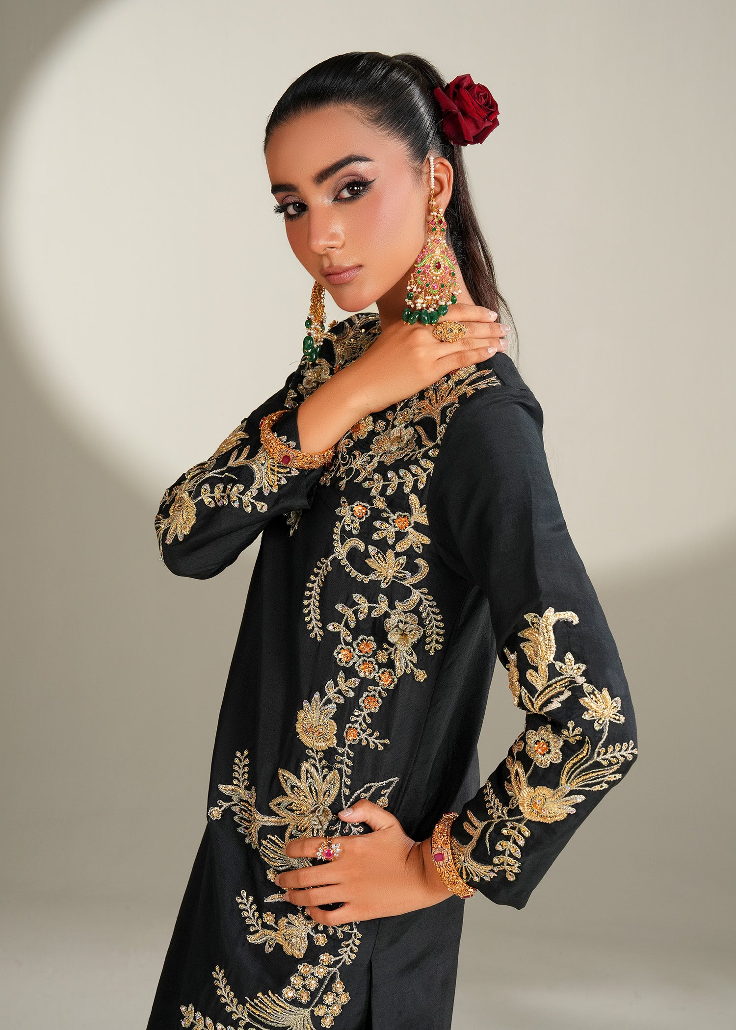 The Black Swan Dress features a luxurious raw silk shirt and trouser, beautifully adorned with delicate gold embellishments. Paired with a graceful organza dupatta highlighted with shimmering gold sequins, this ensemble exudes timeless elegance and sophistication.