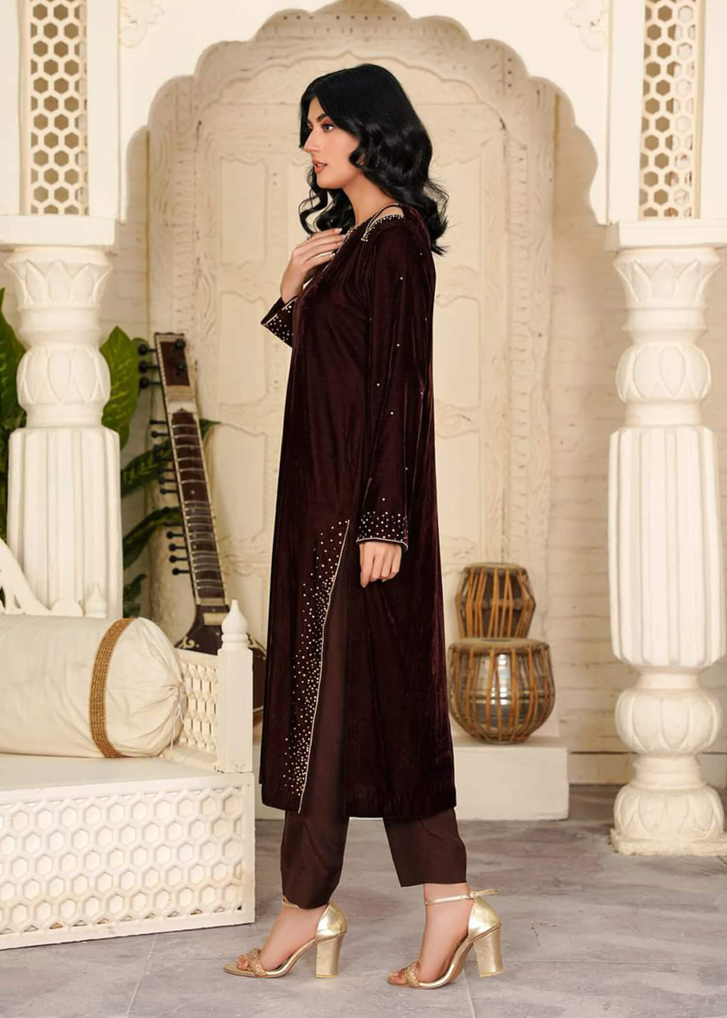 Discription: This elegant brown velvet dress features intricate sequin detailing, adding a touch of glamour. The luxurious velvet material enhances the overall sophistication, making it a perfect choice for special occasions.