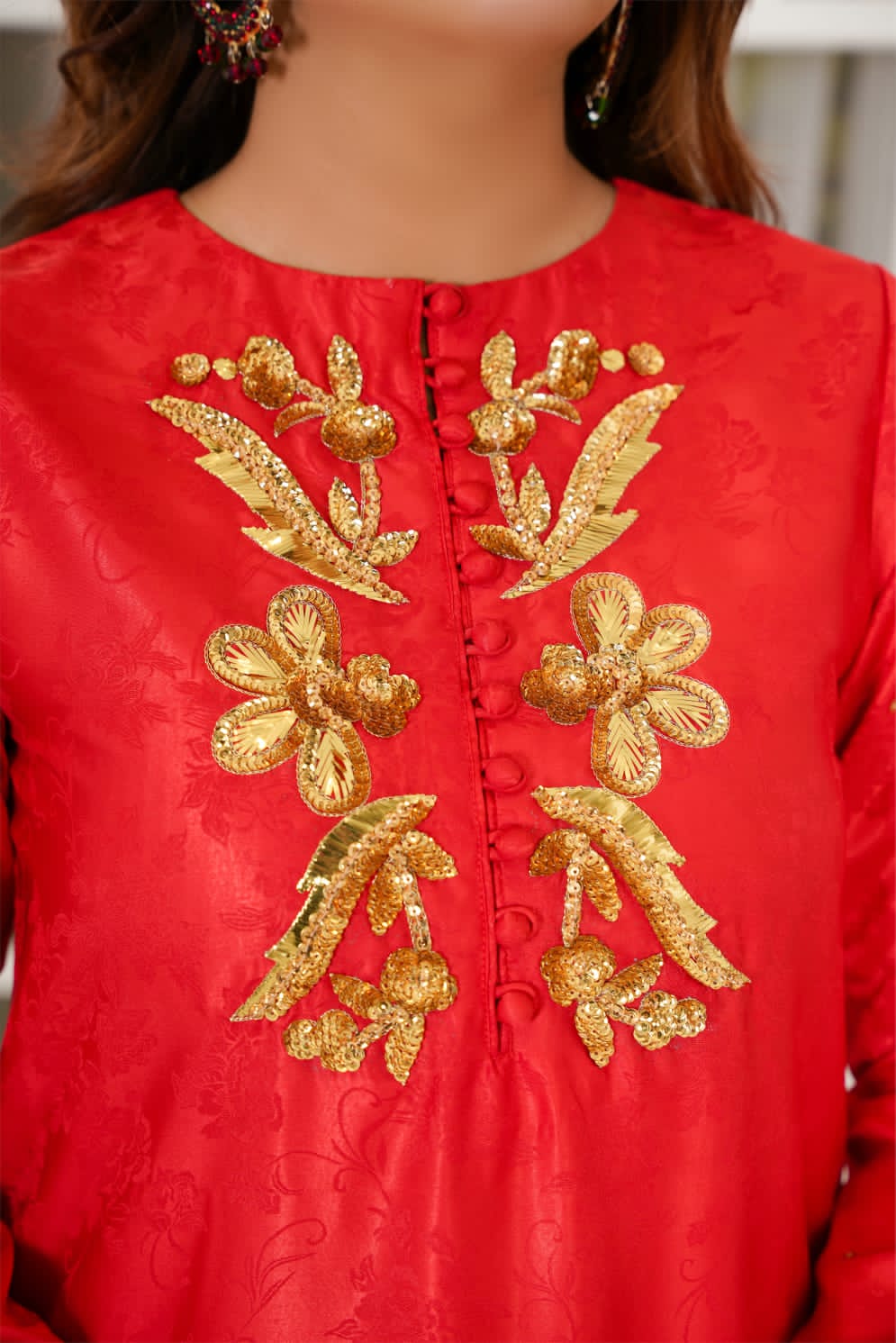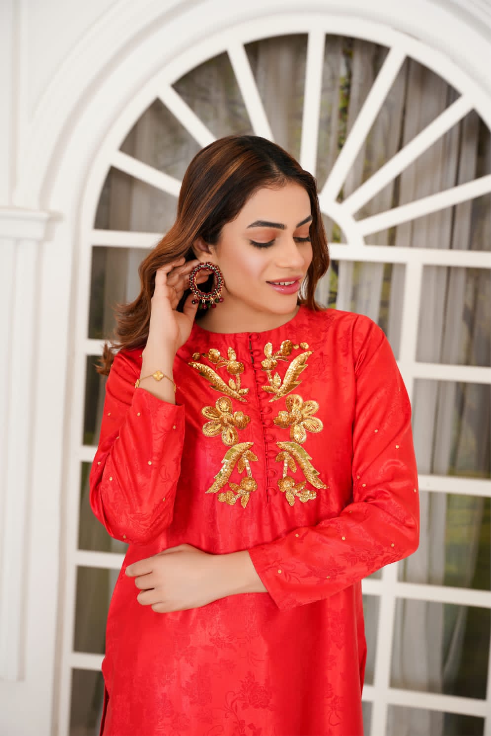 Elegant and timeless, this pure silk shirt in a rich red hue features a delicately crafted motif on the neckline, adding a touch of sophistication. Designed for effortless grace, its luxurious fabric drapes beautifully, making it perfect for both formal and festive occasions.