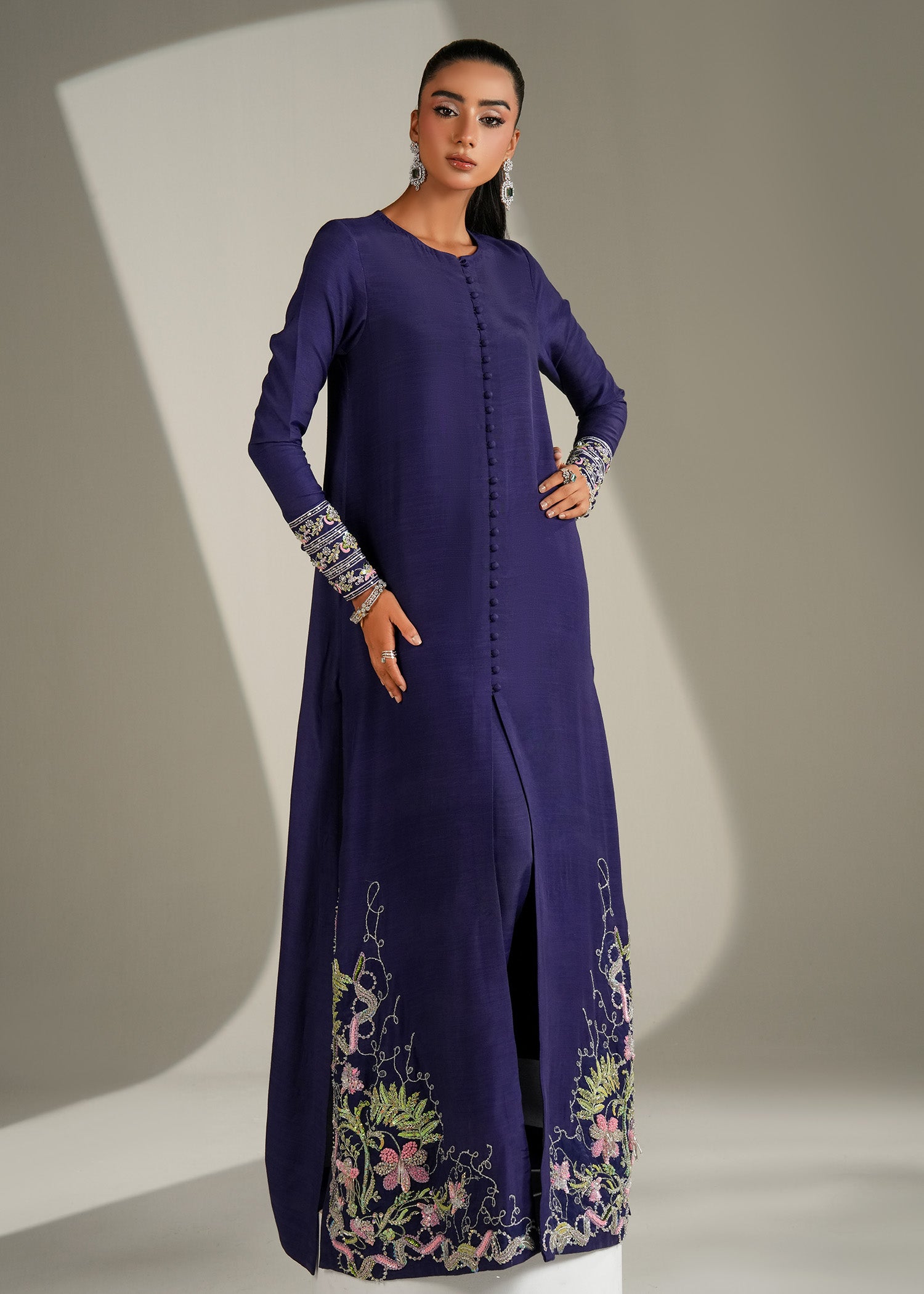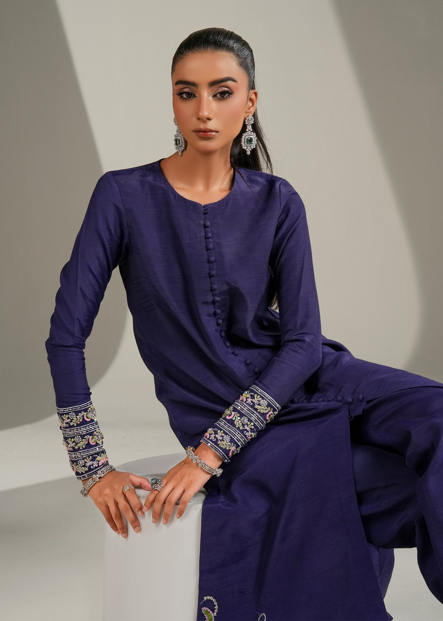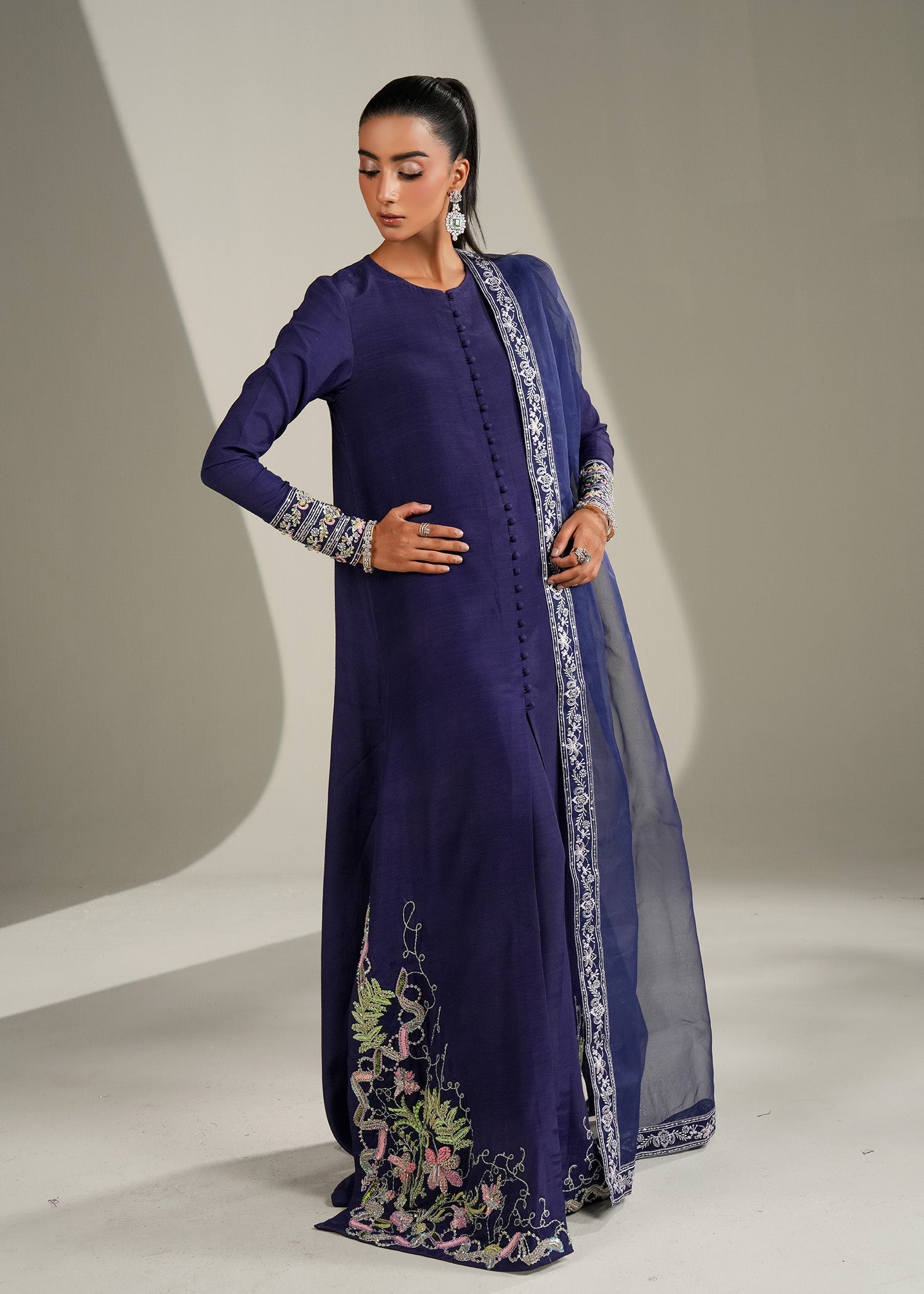 The Iris Mist Dress features a luxurious raw silk shirt and trouser, paired with a delicate organza dupatta adorned with fine embellishments. With its dreamy purple-blue hues and elegant detailing, this ensemble captures the perfect balance of sophistication and charm.