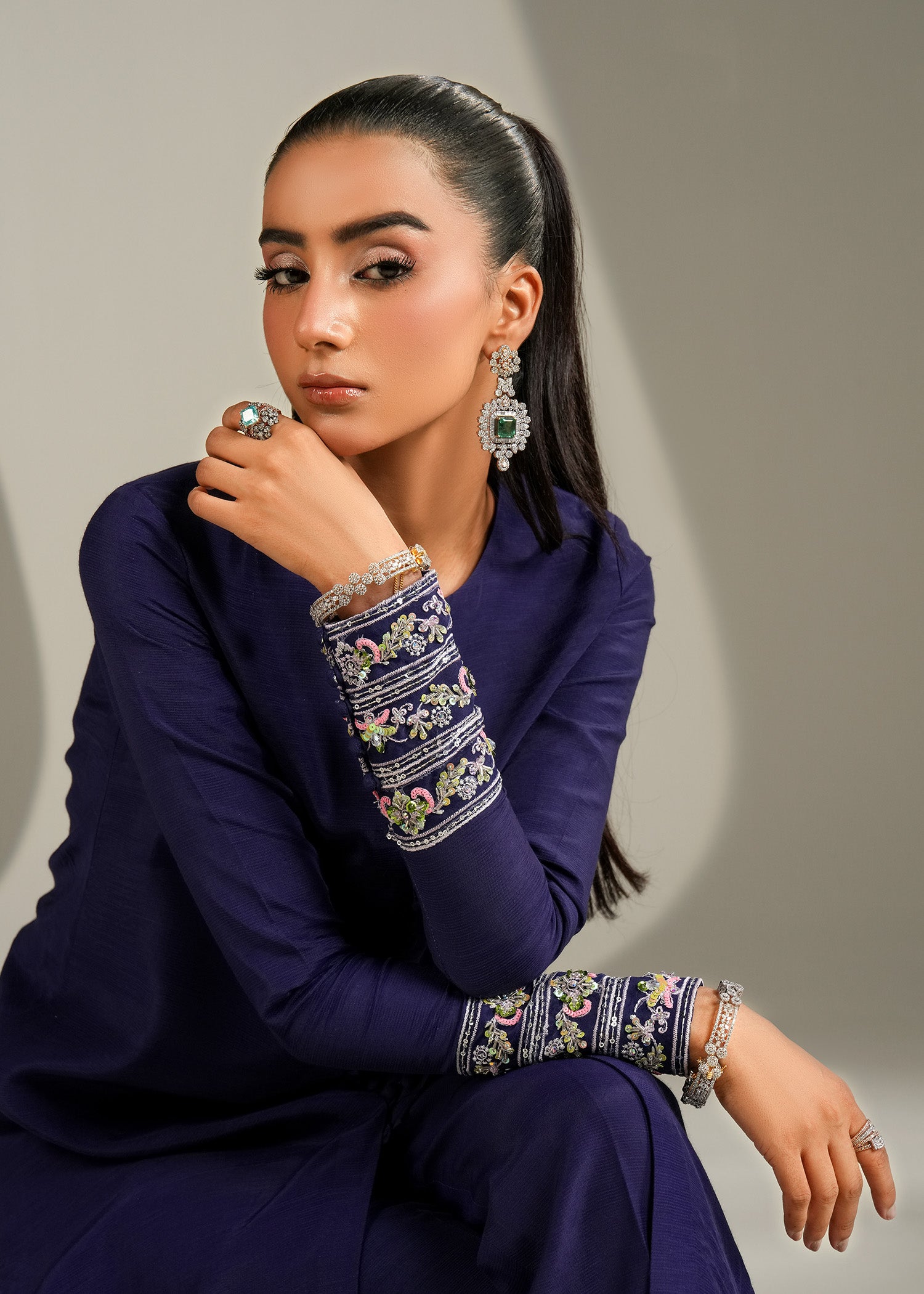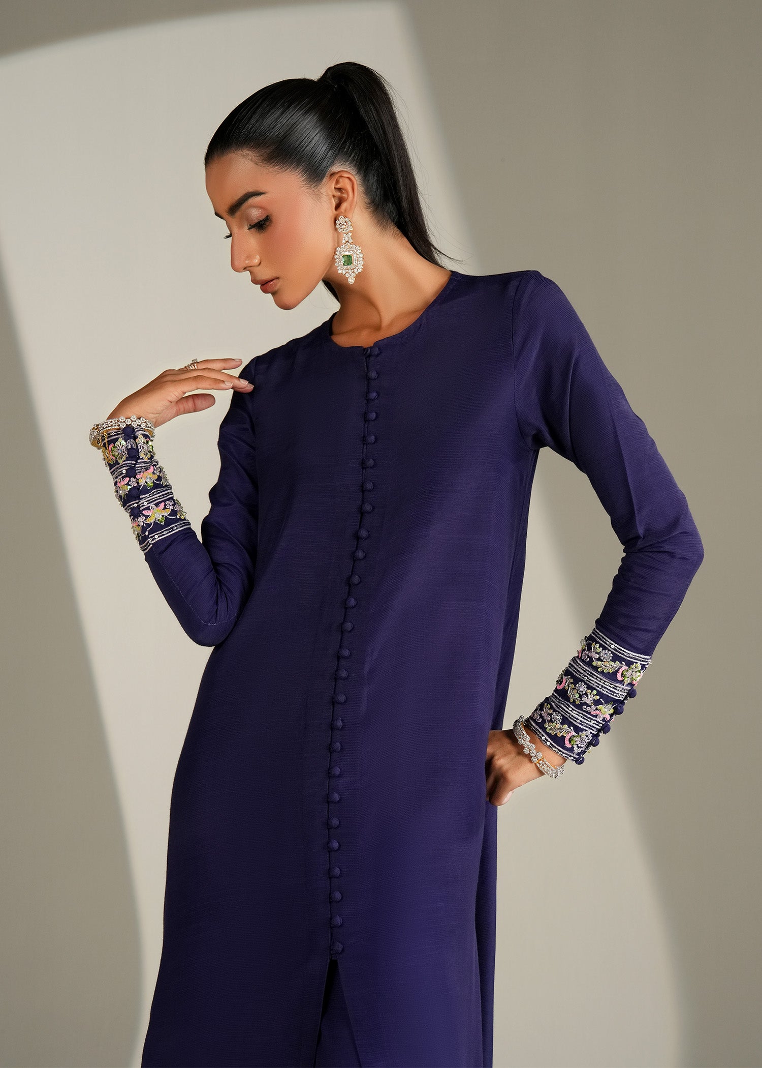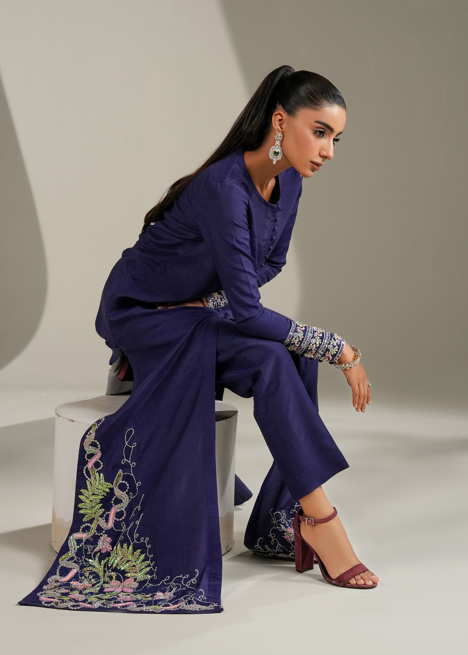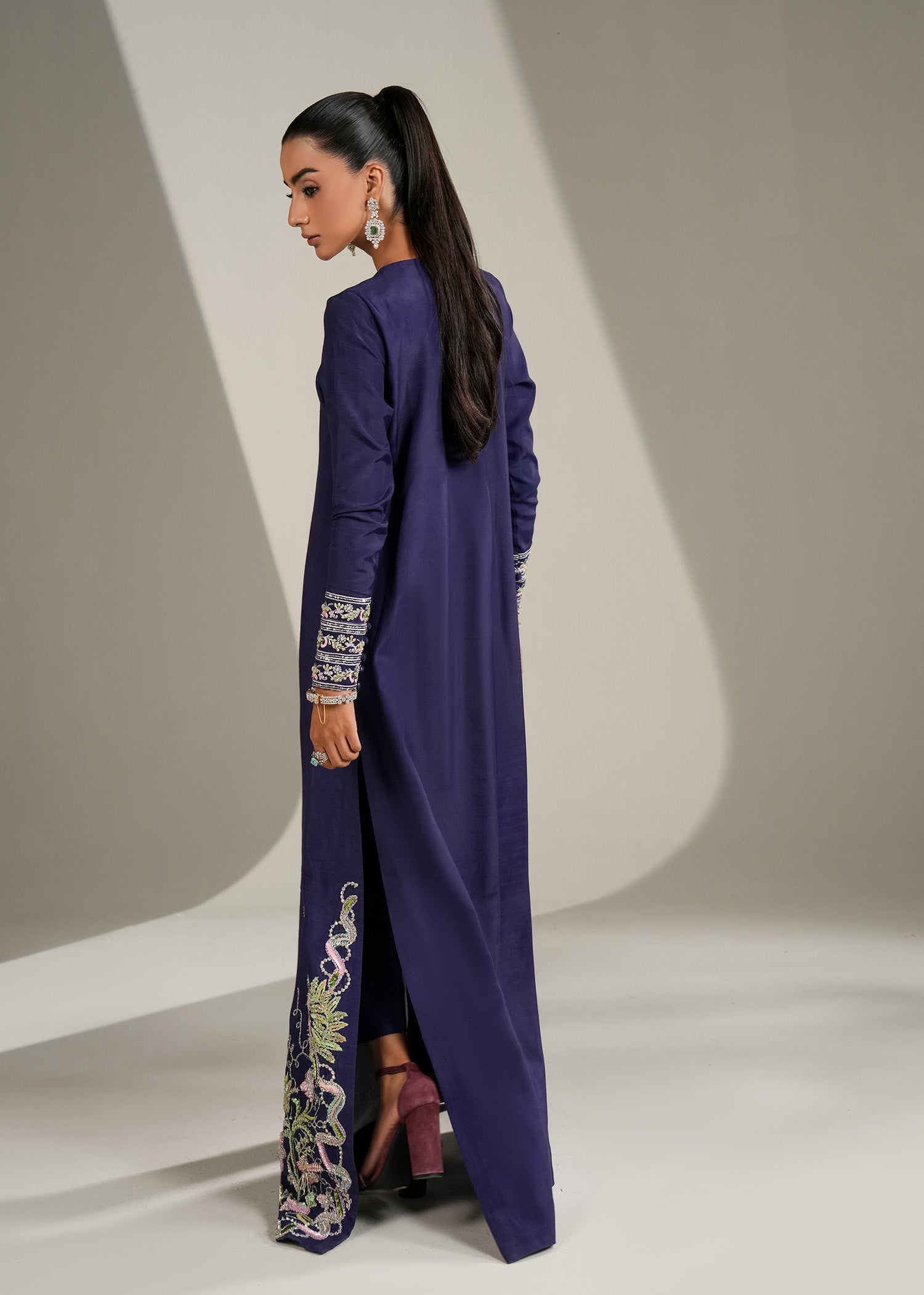 The Iris Mist Dress features a luxurious raw silk shirt and trouser, paired with a delicate organza dupatta adorned with fine embellishments. With its dreamy purple-blue hues and elegant detailing, this ensemble captures the perfect balance of sophistication and charm.