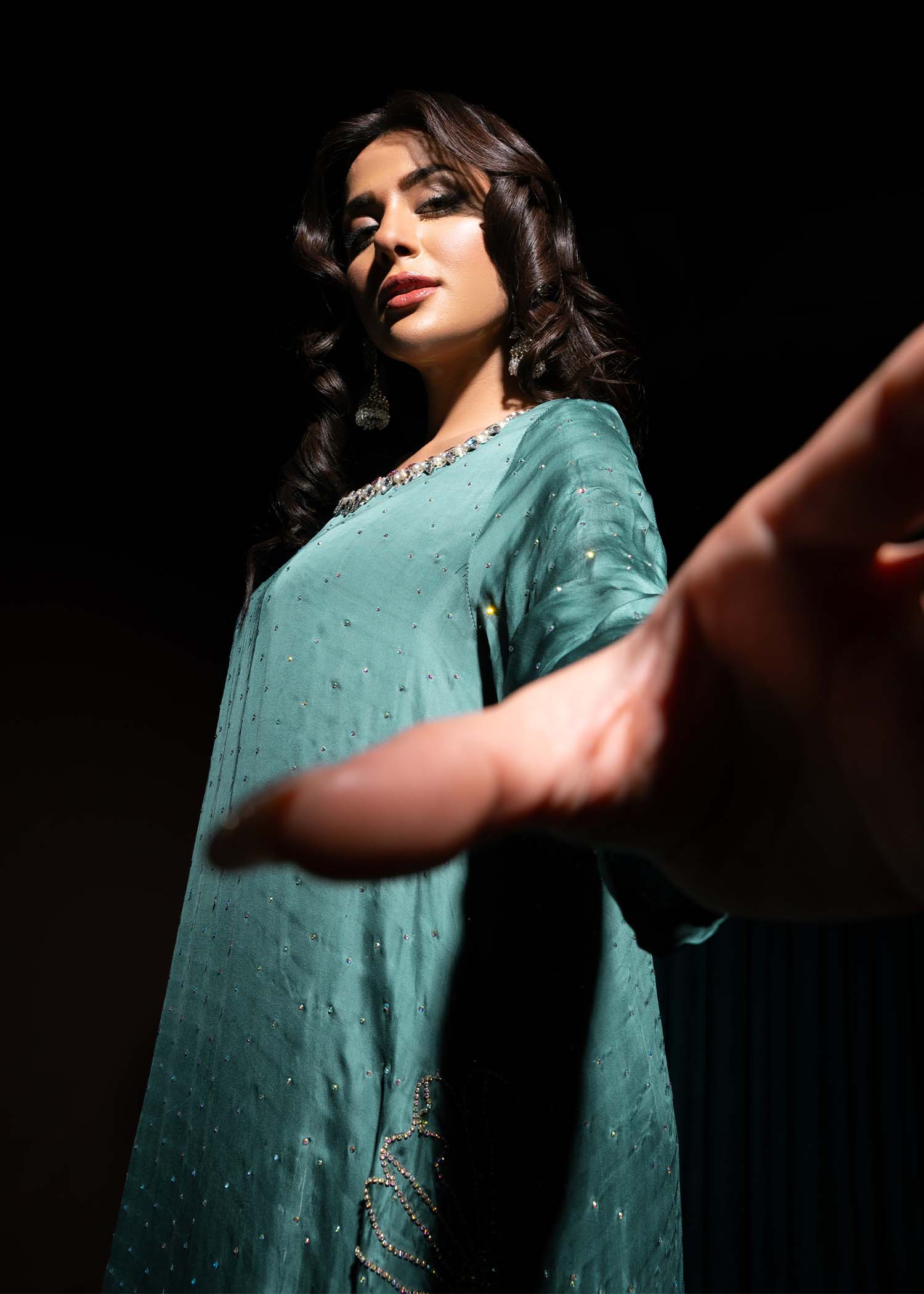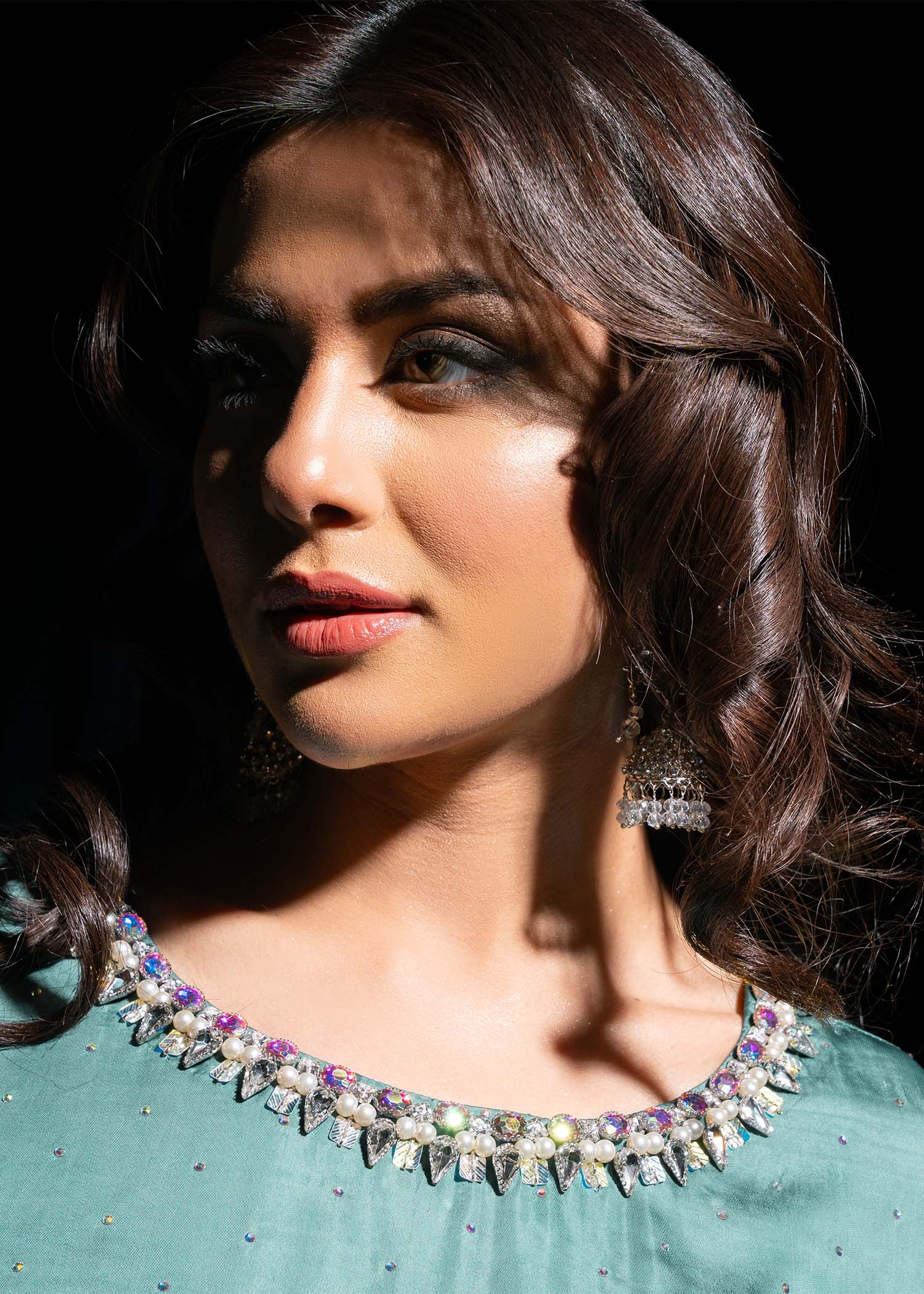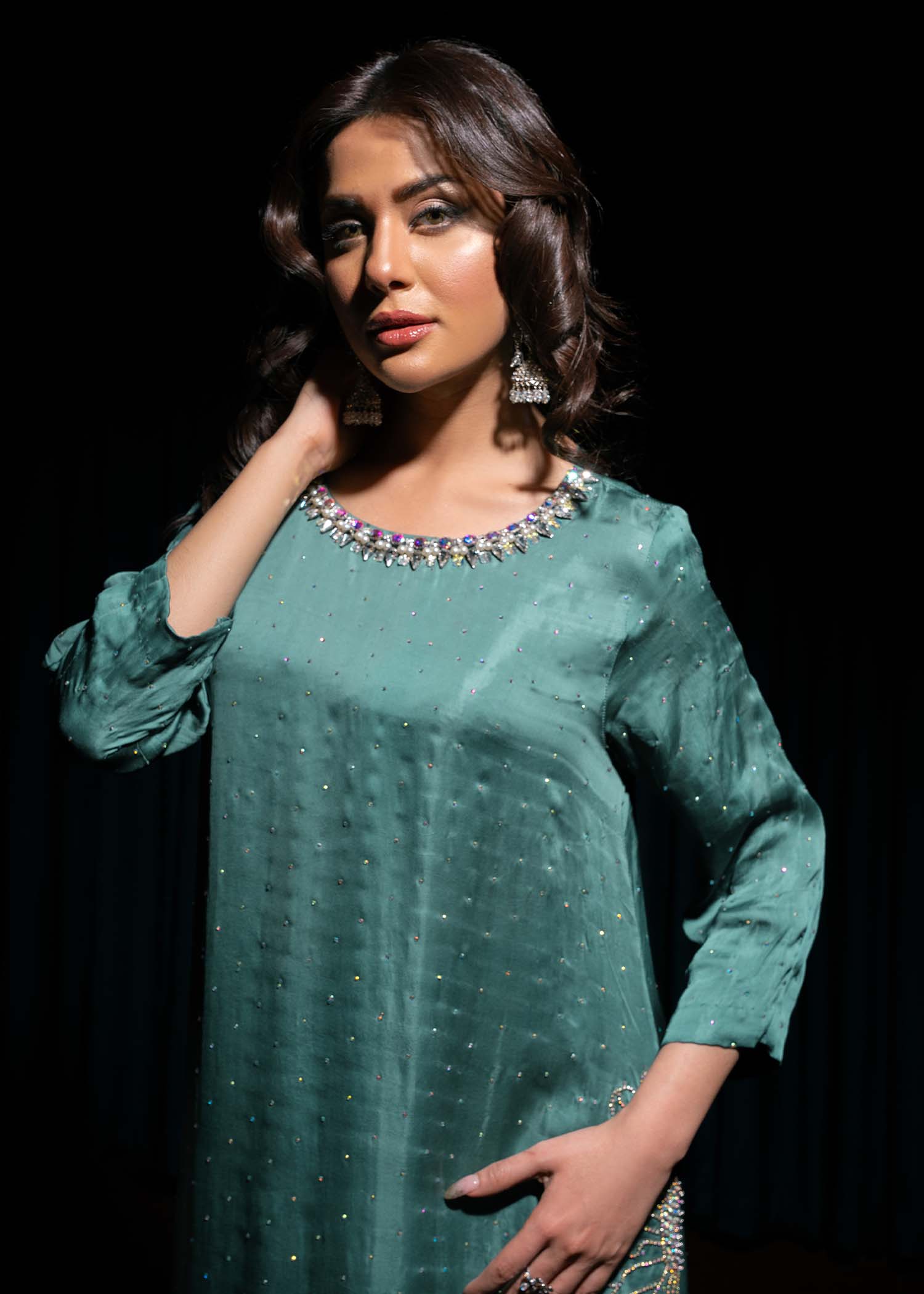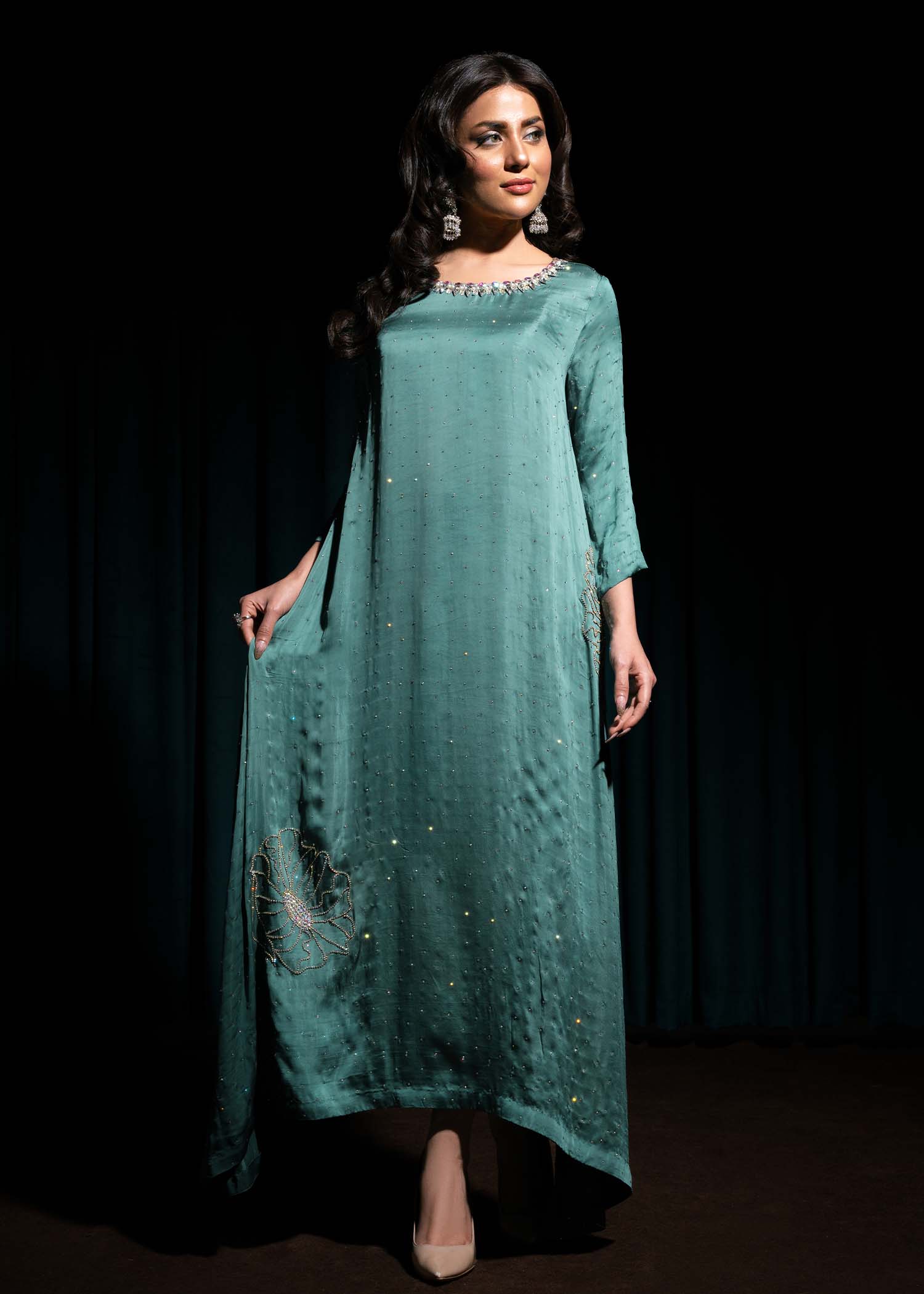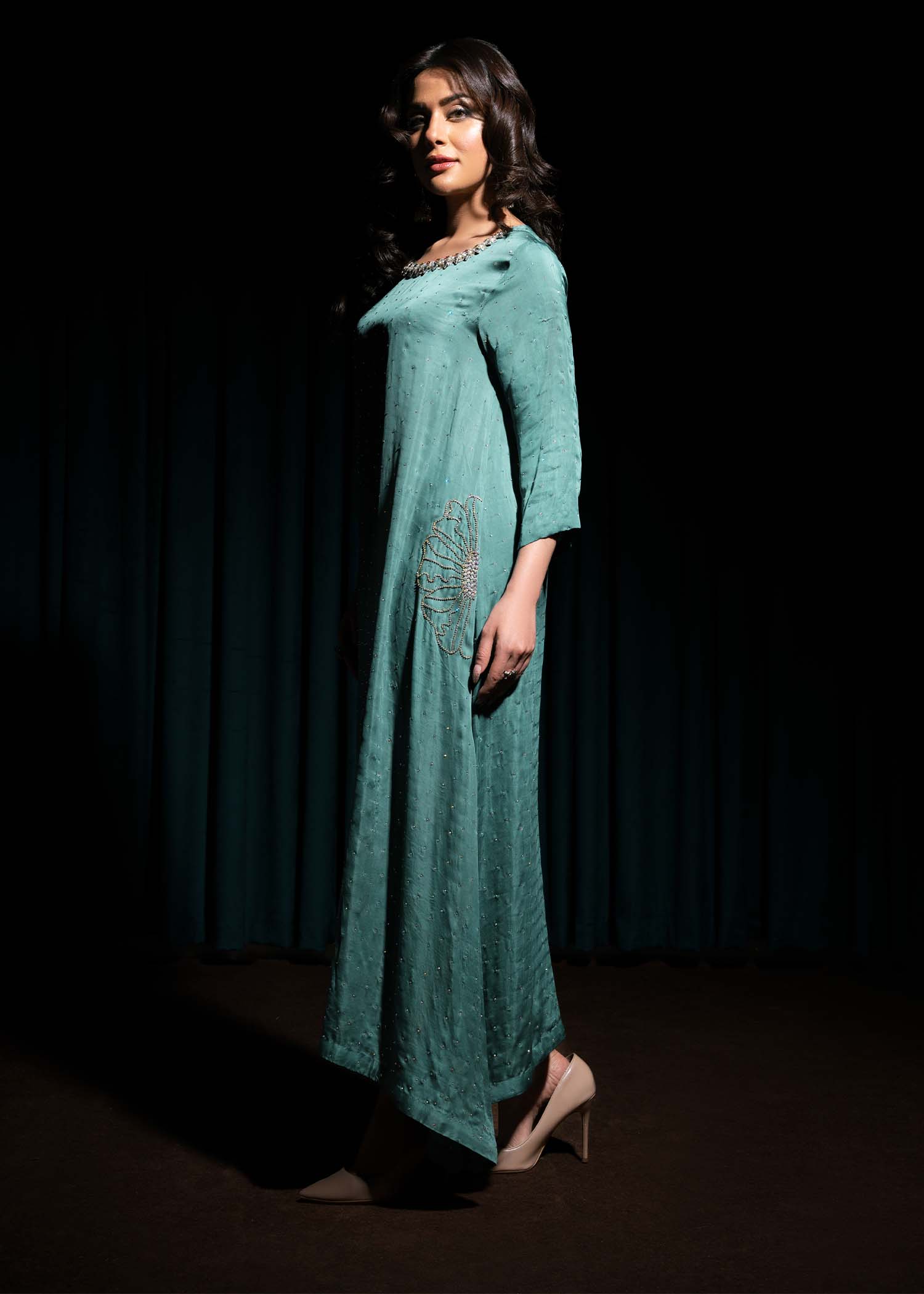 The Jade Silk Shirt is a stunning piece, crafted from luxurious jade-colored silk that drapes effortlessly. Delicate flower embellishments adorn the fabric, adding a soft, feminine touch, while Swarovski crystals bring a subtle sparkle to the design. This shirt blends elegance with intricate details, making it perfect for both casual and formal occasions. Its timeless charm and refined style make it a standout piece for any wardrobe.