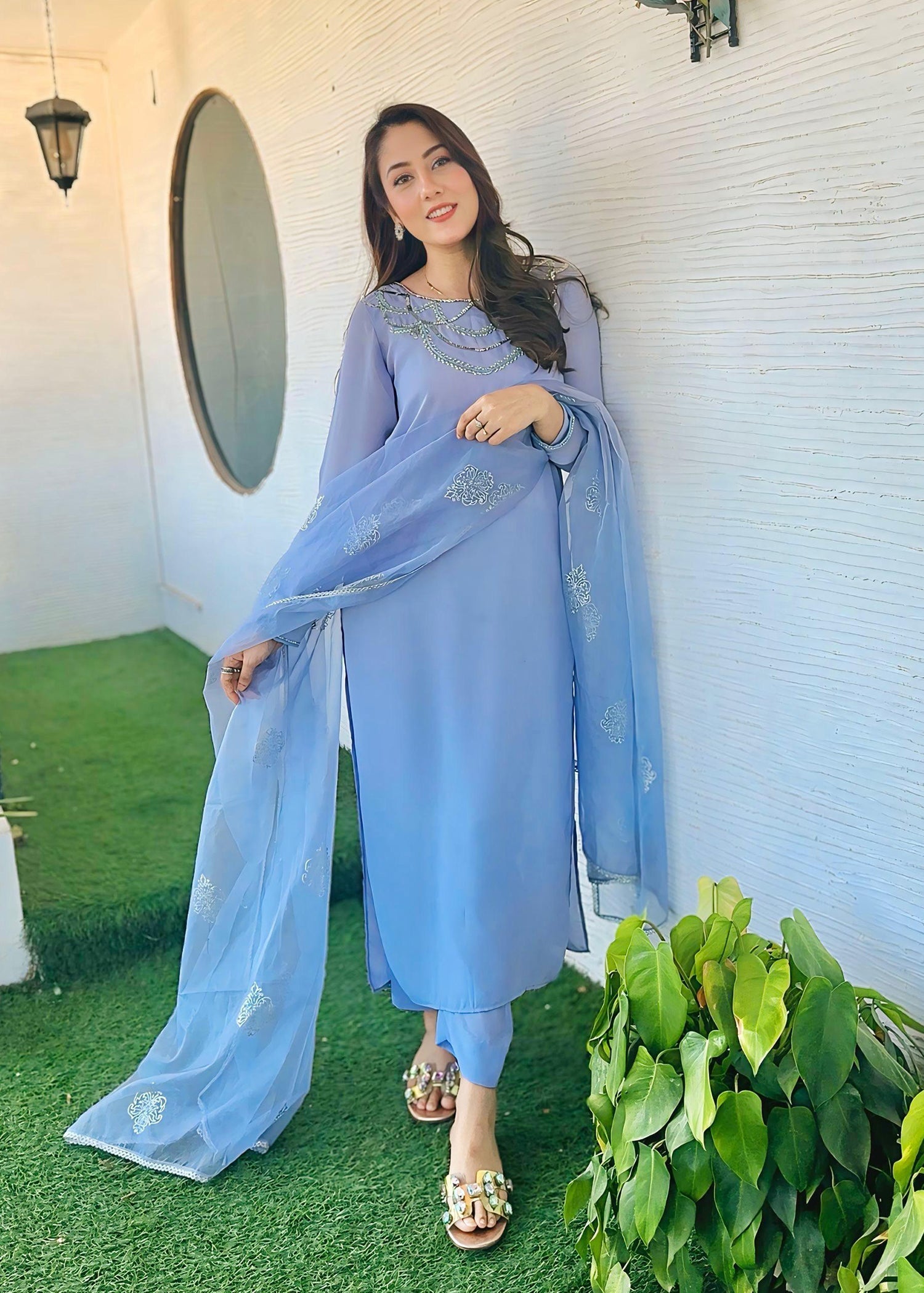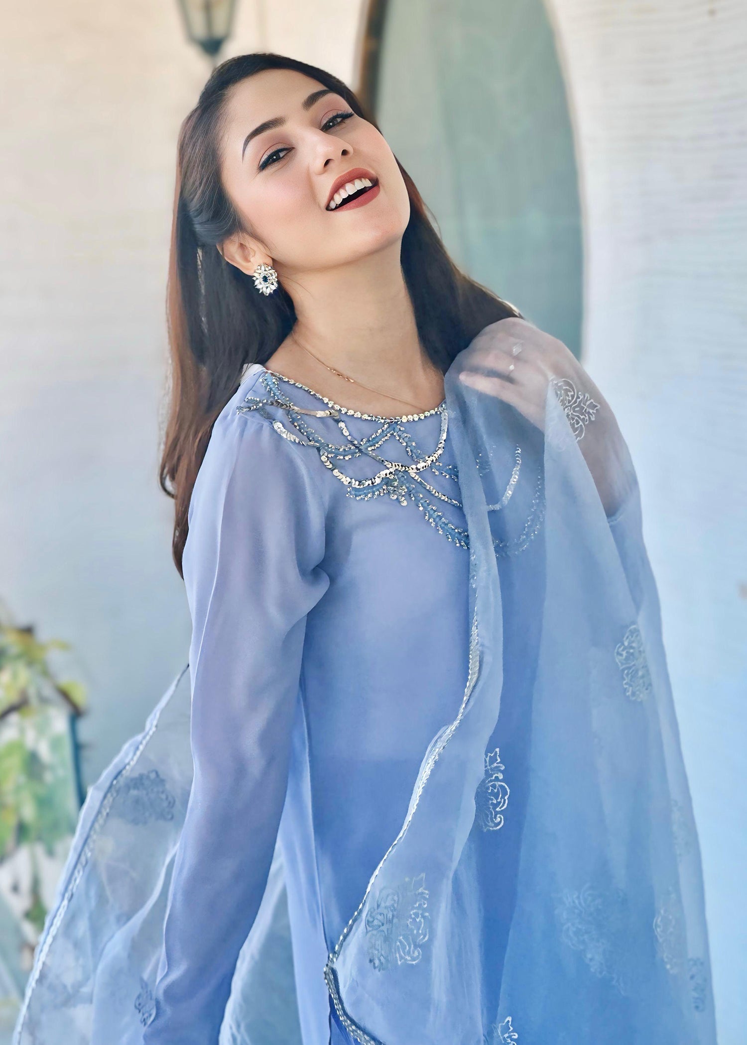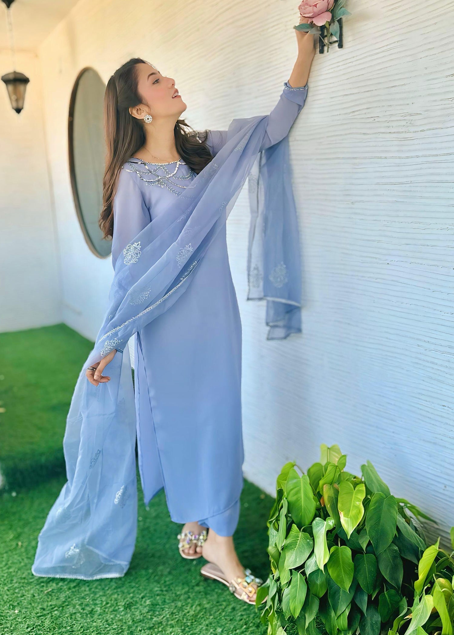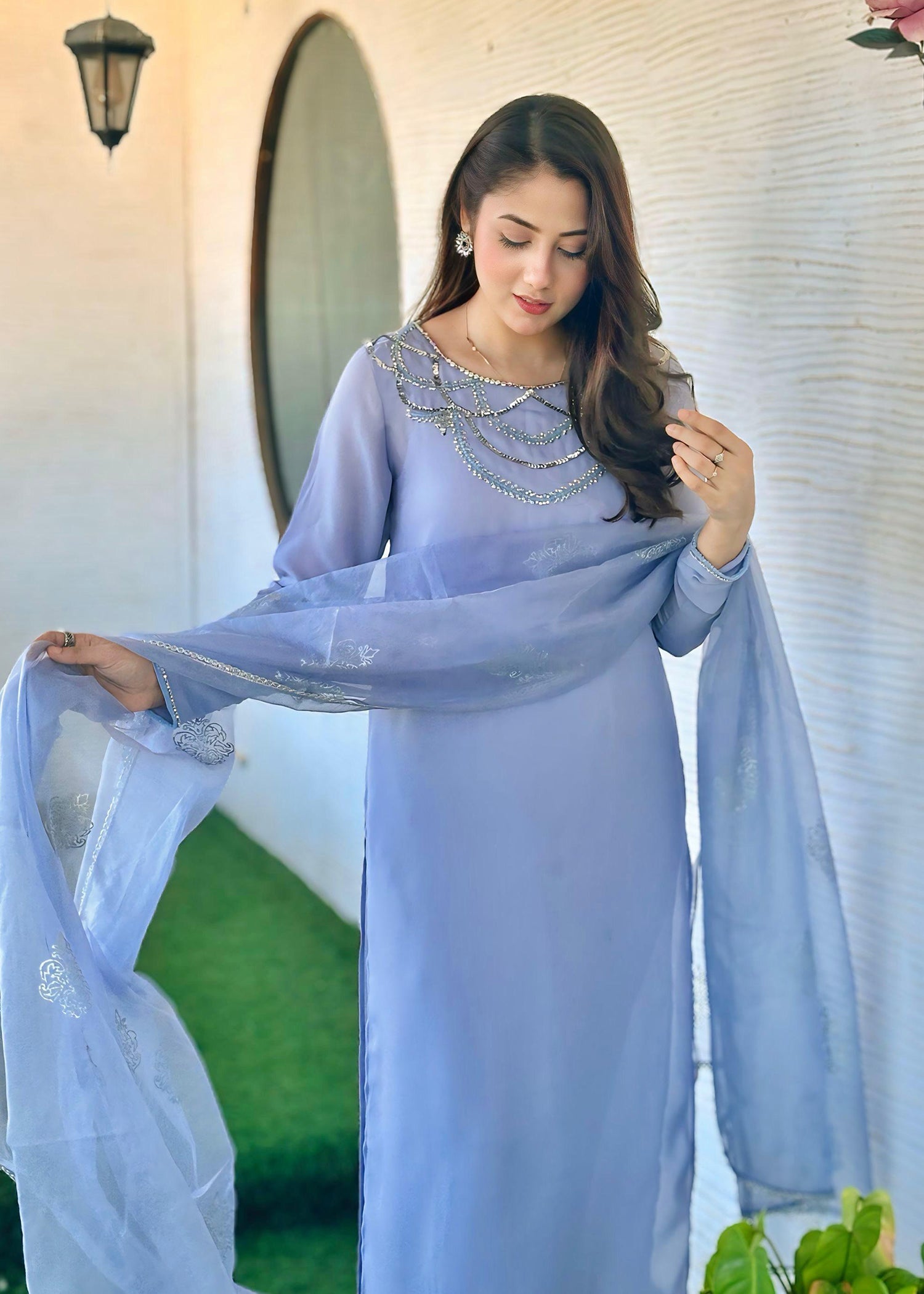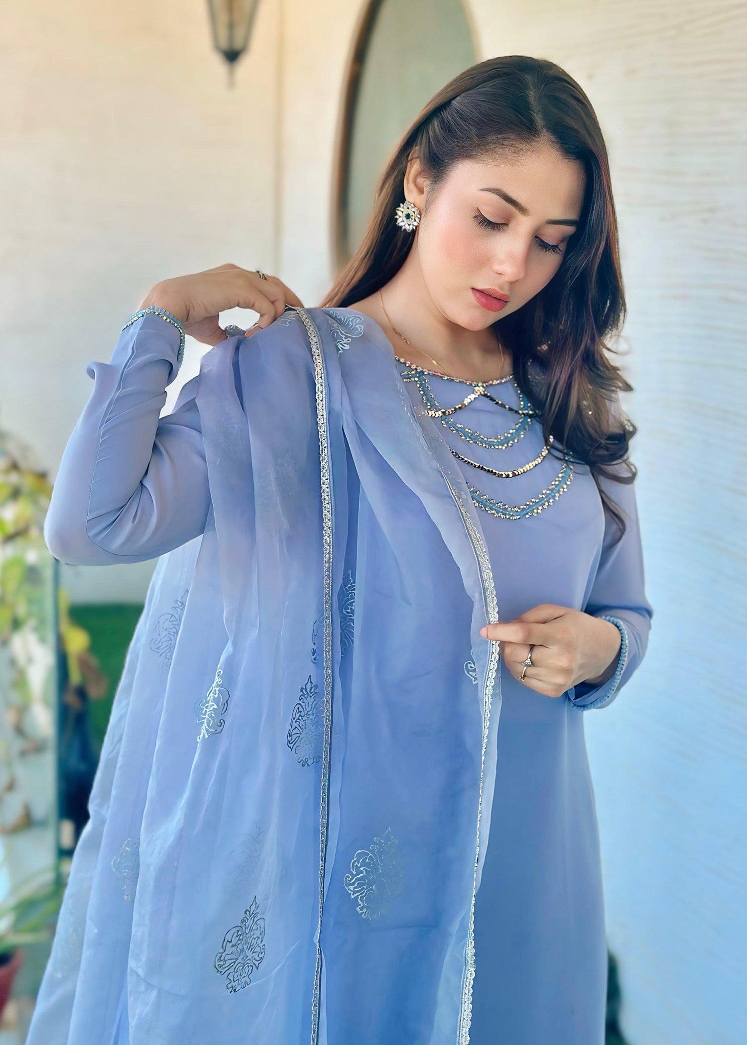 Lavender Elegance Ensemble: A soft lavender dress adorned with delicate neck embellishments, paired with a block-printed organza dupatta. The fusion of intricate detailing and the artistic print on the dupatta creates a graceful, timeless look, ideal for both formal and festive occasions.