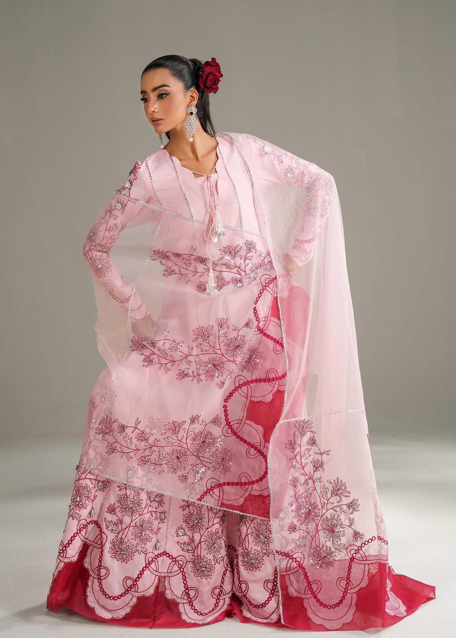 The Rose Aura Dress is a timeless statement of elegance, featuring a raw silk panel frock beautifully adorned with delicate embellishments. Paired with a graceful organza dupatta, this ensemble blends sophistication with charm, making it a perfect choice for formal occasions, festive wear, or wedding events.