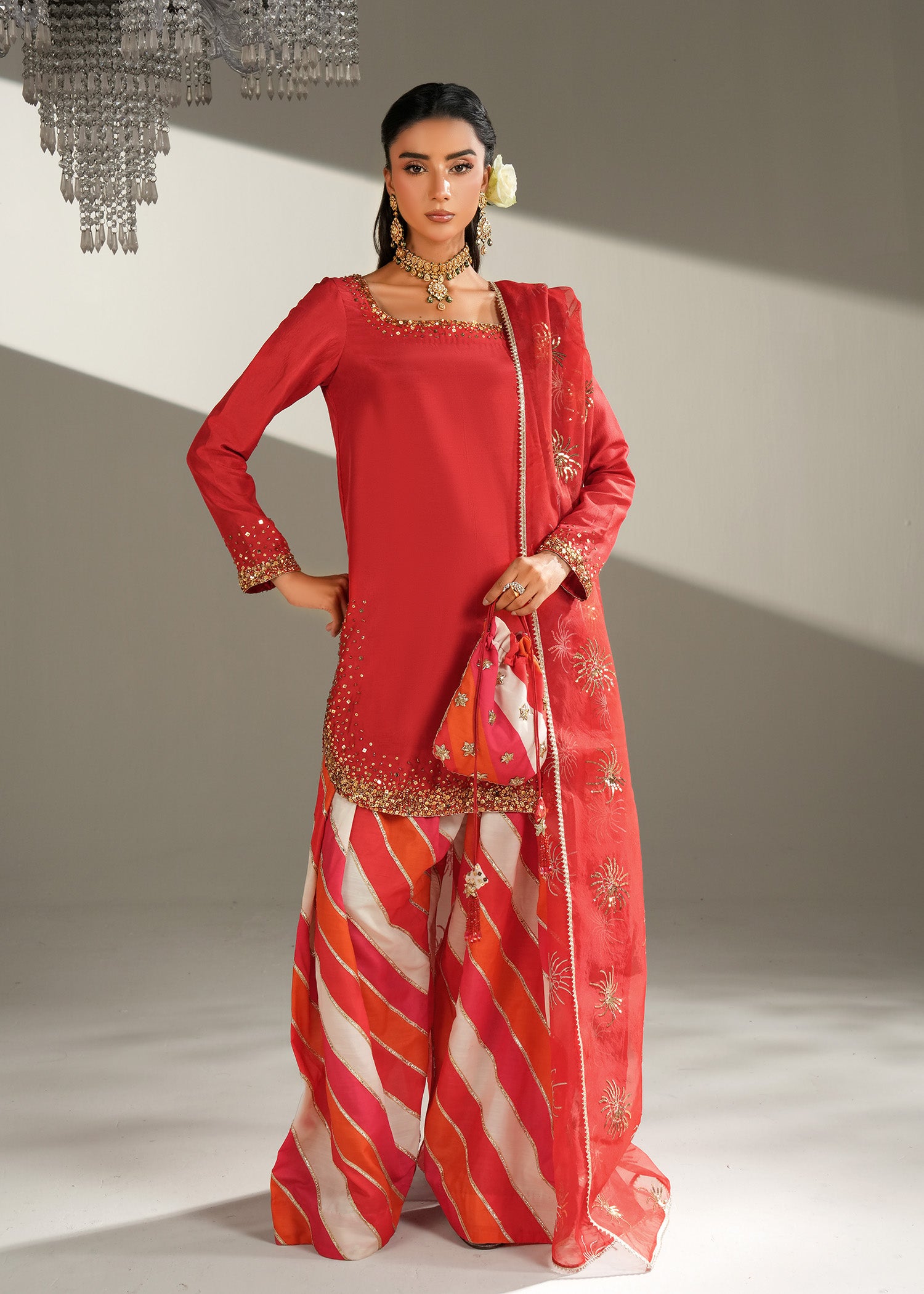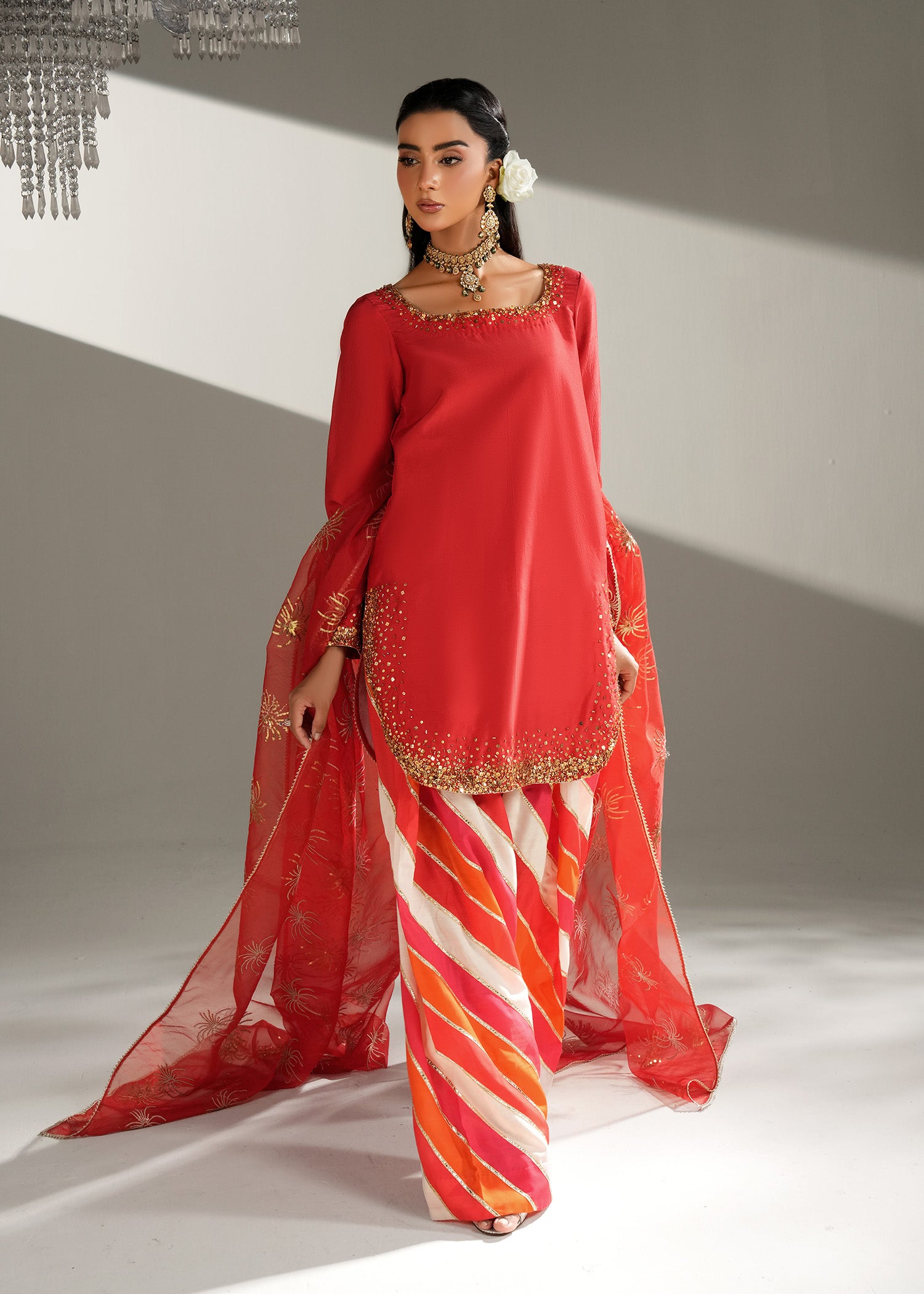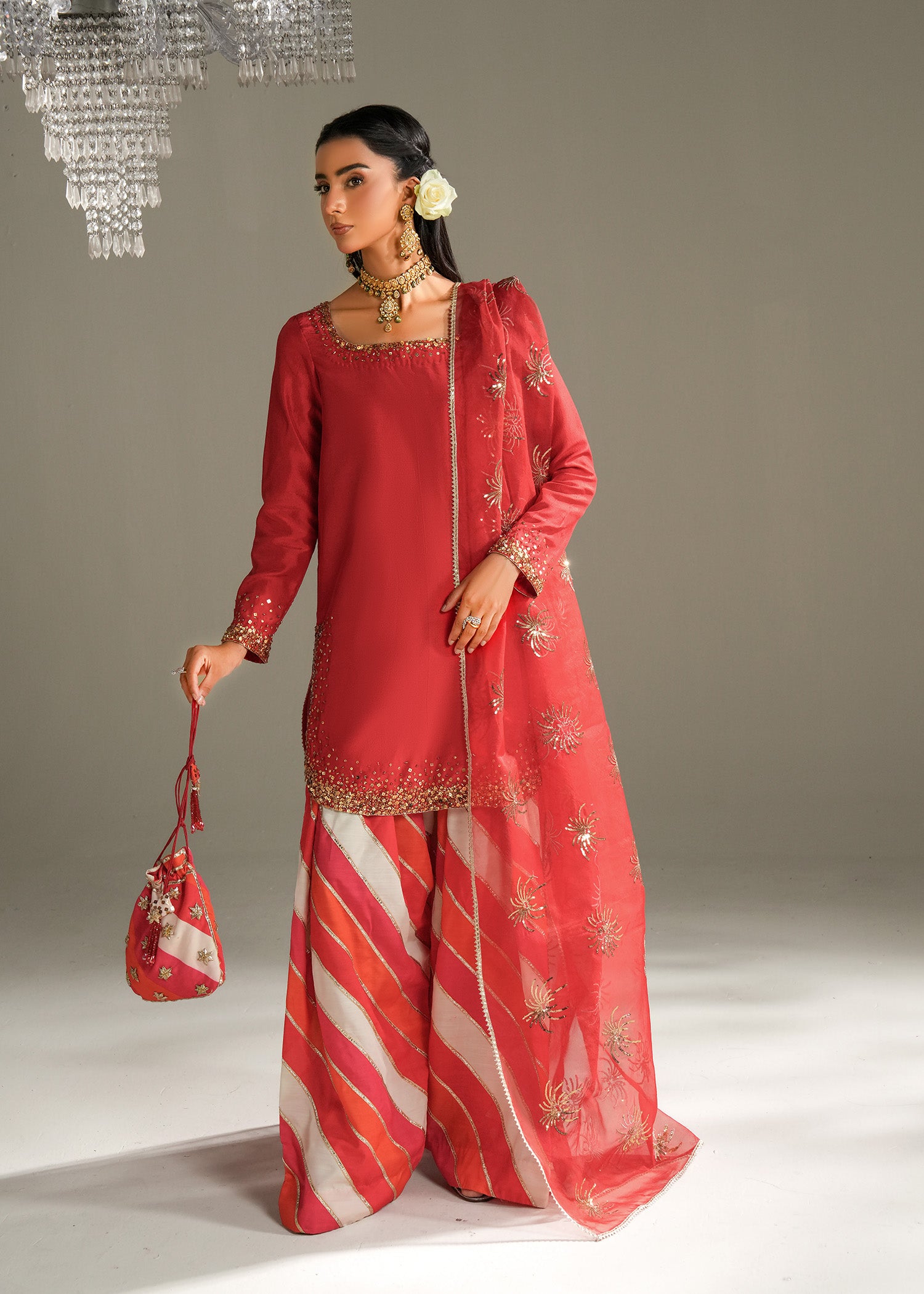 The Rouge Dress is crafted from luxurious red raw silk, featuring a beautifully hand-embellished shirt paired with a classic raw silk chatapatti shalwar. The look is completed with an elegant organza dupatta, delicately adorned with shimmering sequins, creating a timeless statement of sophistication.