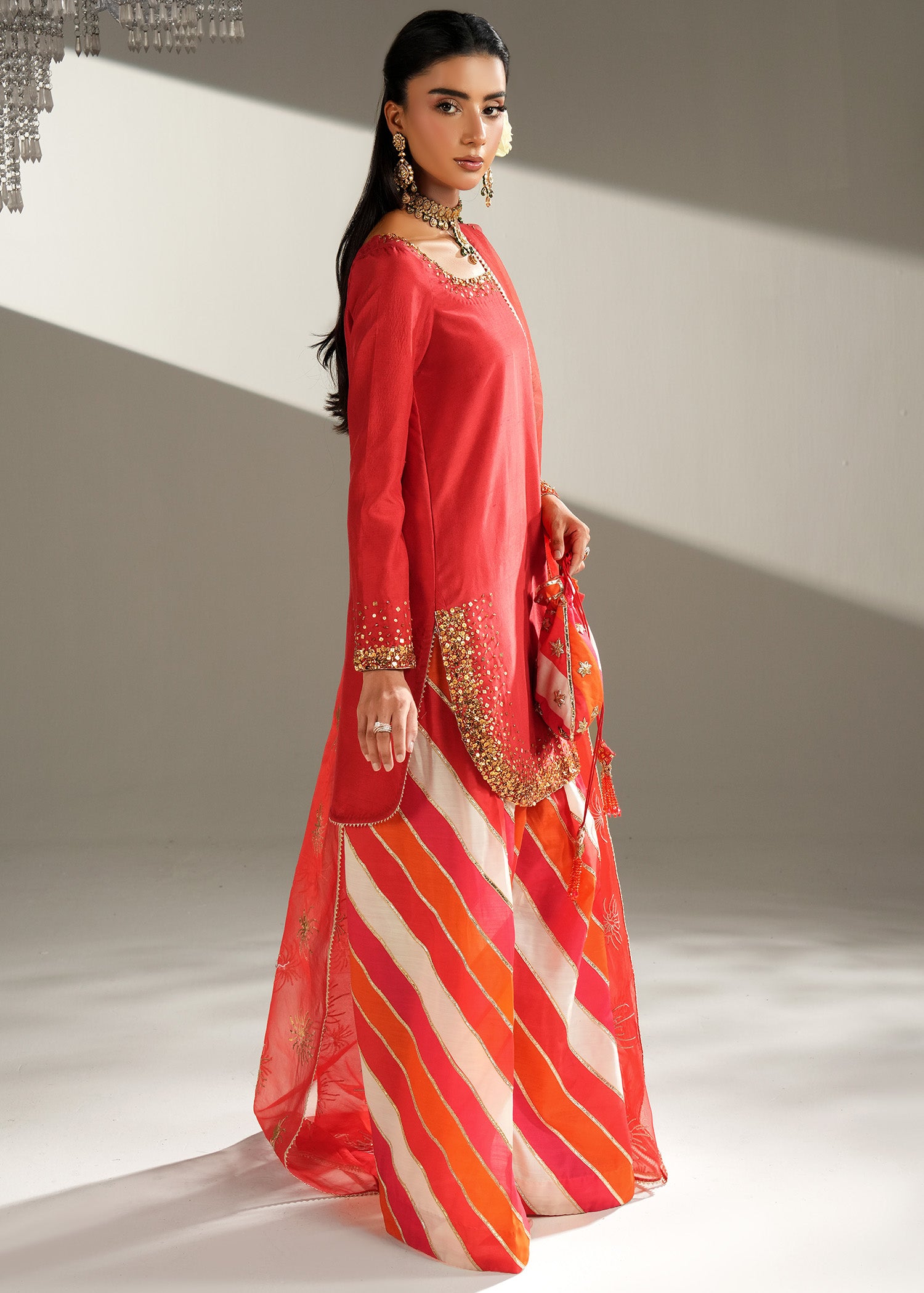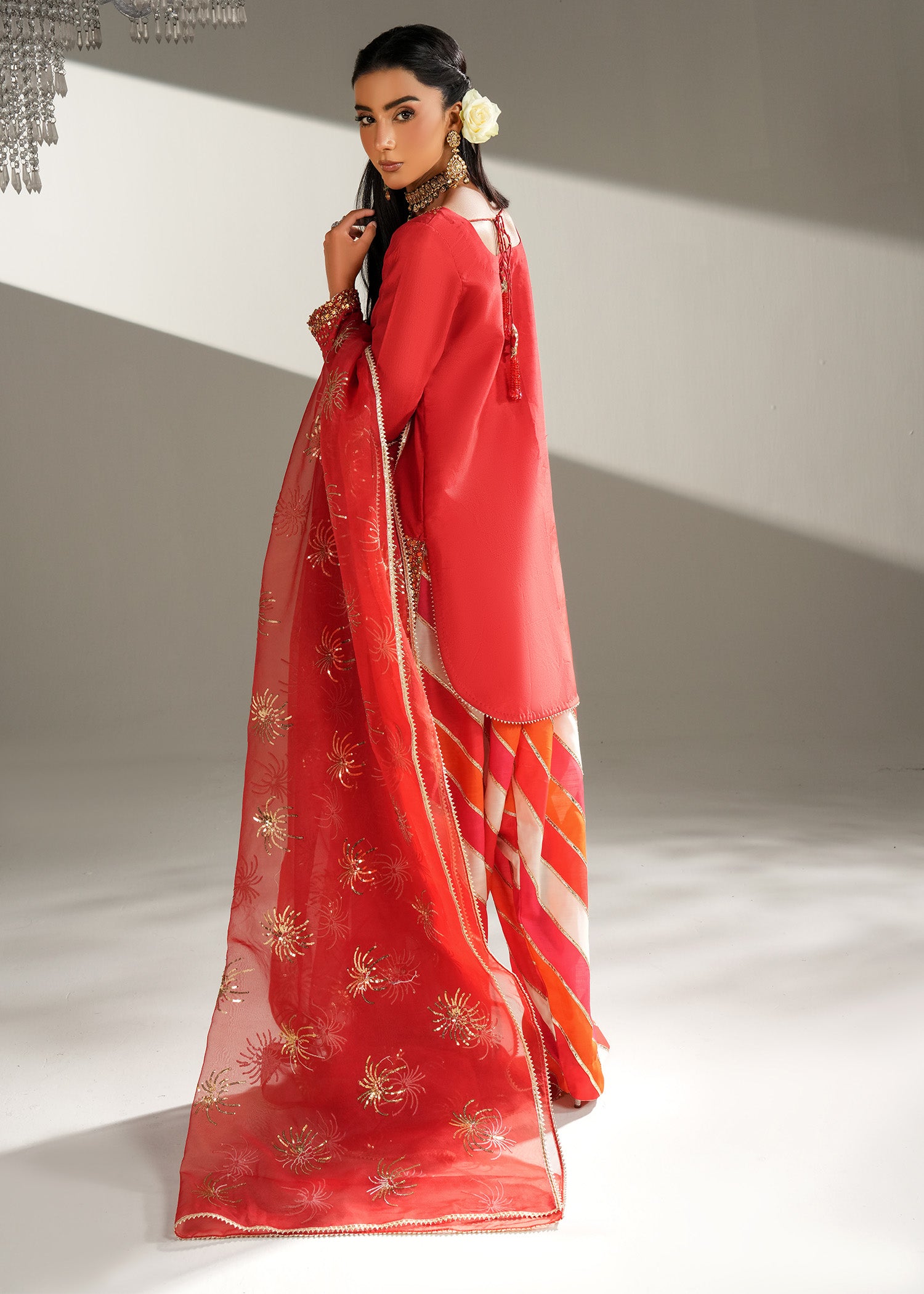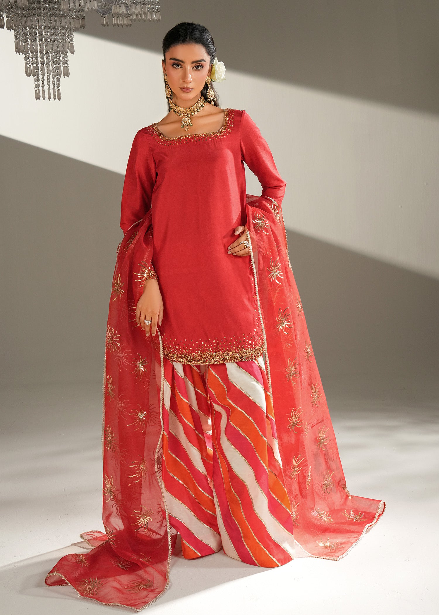 The Rouge Dress is crafted from luxurious red raw silk, featuring a beautifully hand-embellished shirt paired with a classic raw silk chatapatti shalwar. The look is completed with an elegant organza dupatta, delicately adorned with shimmering sequins, creating a timeless statement of sophistication.