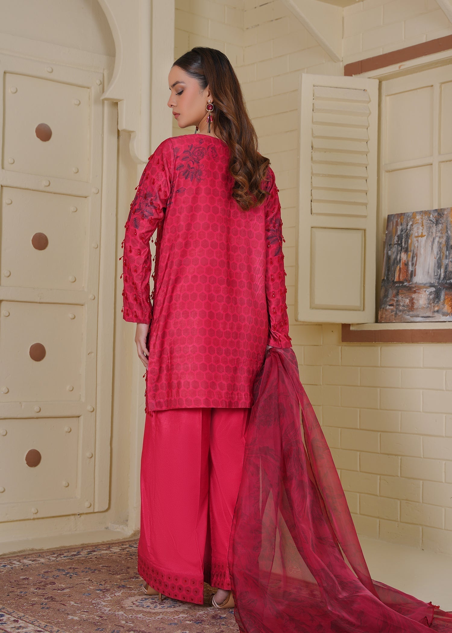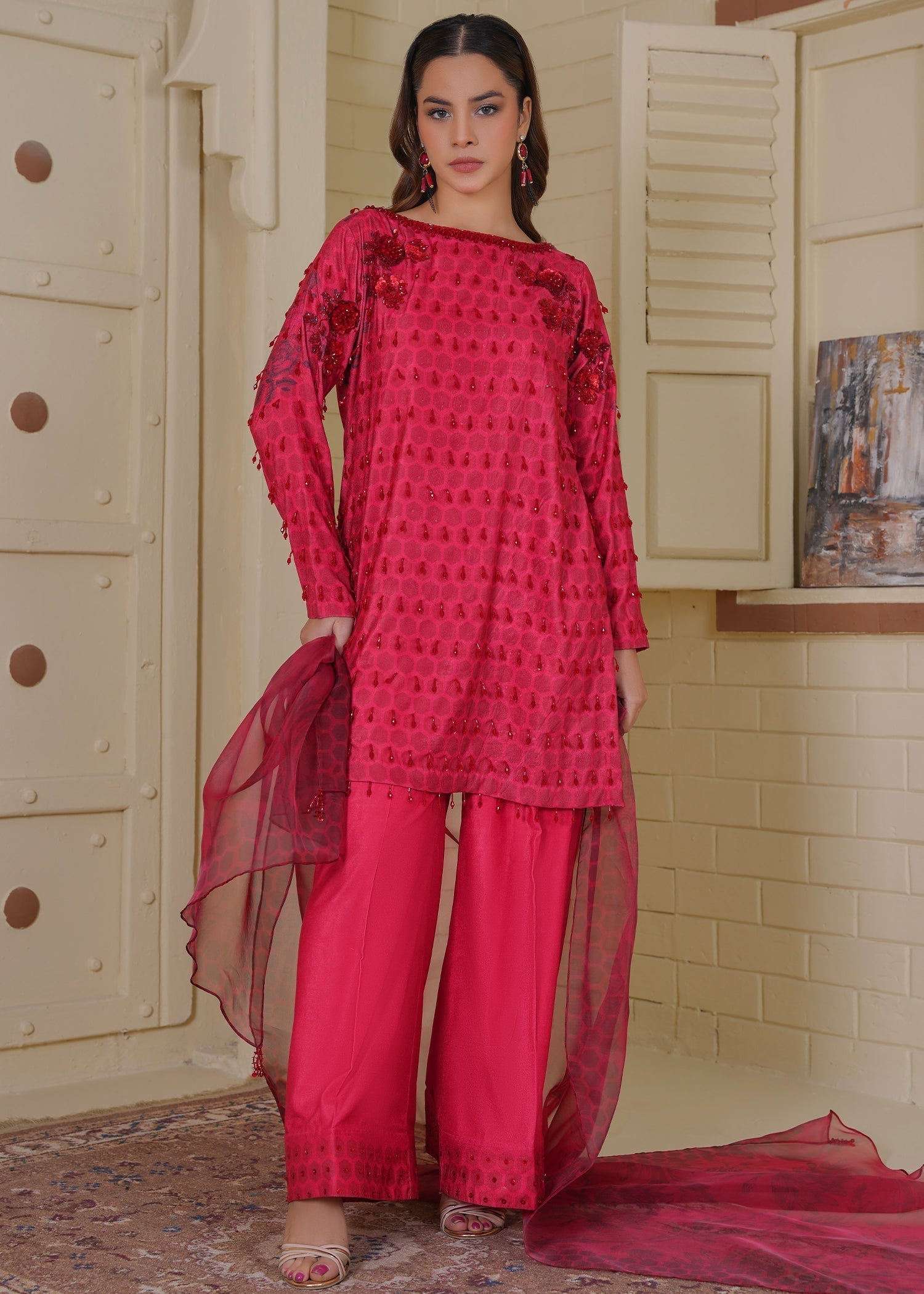 Details of Fabric: Printed velvet shirt trouser organza duppata