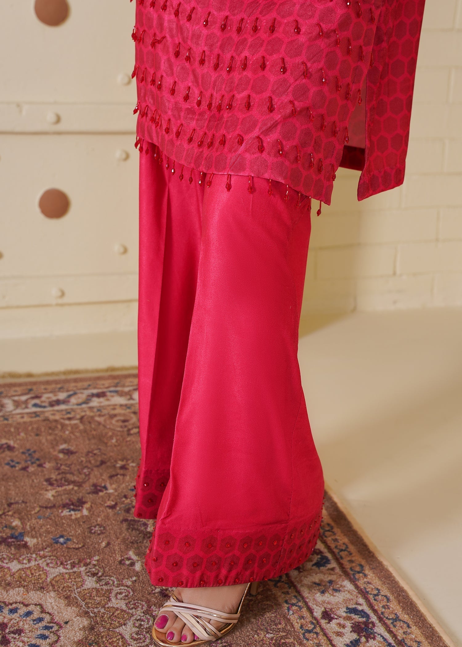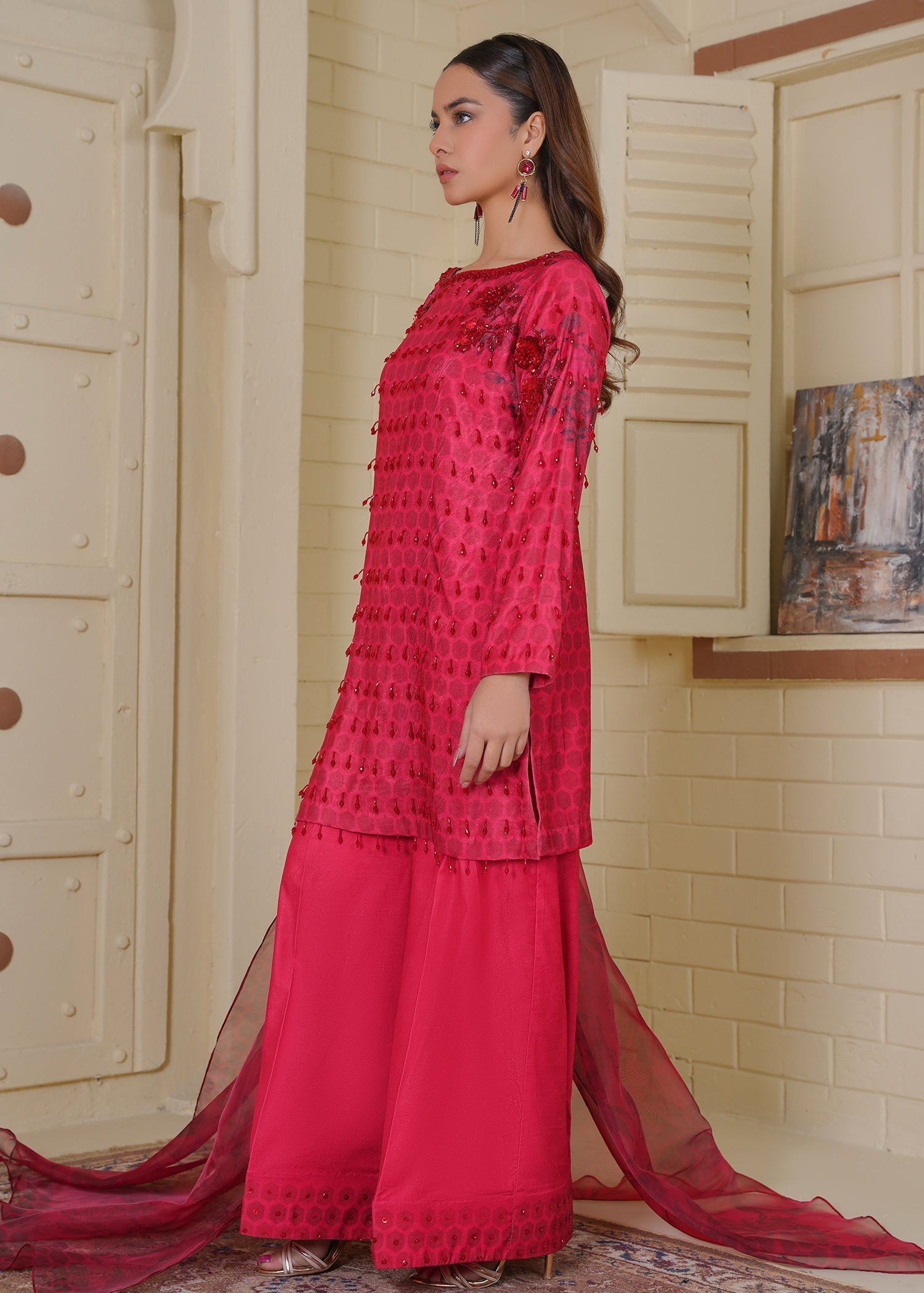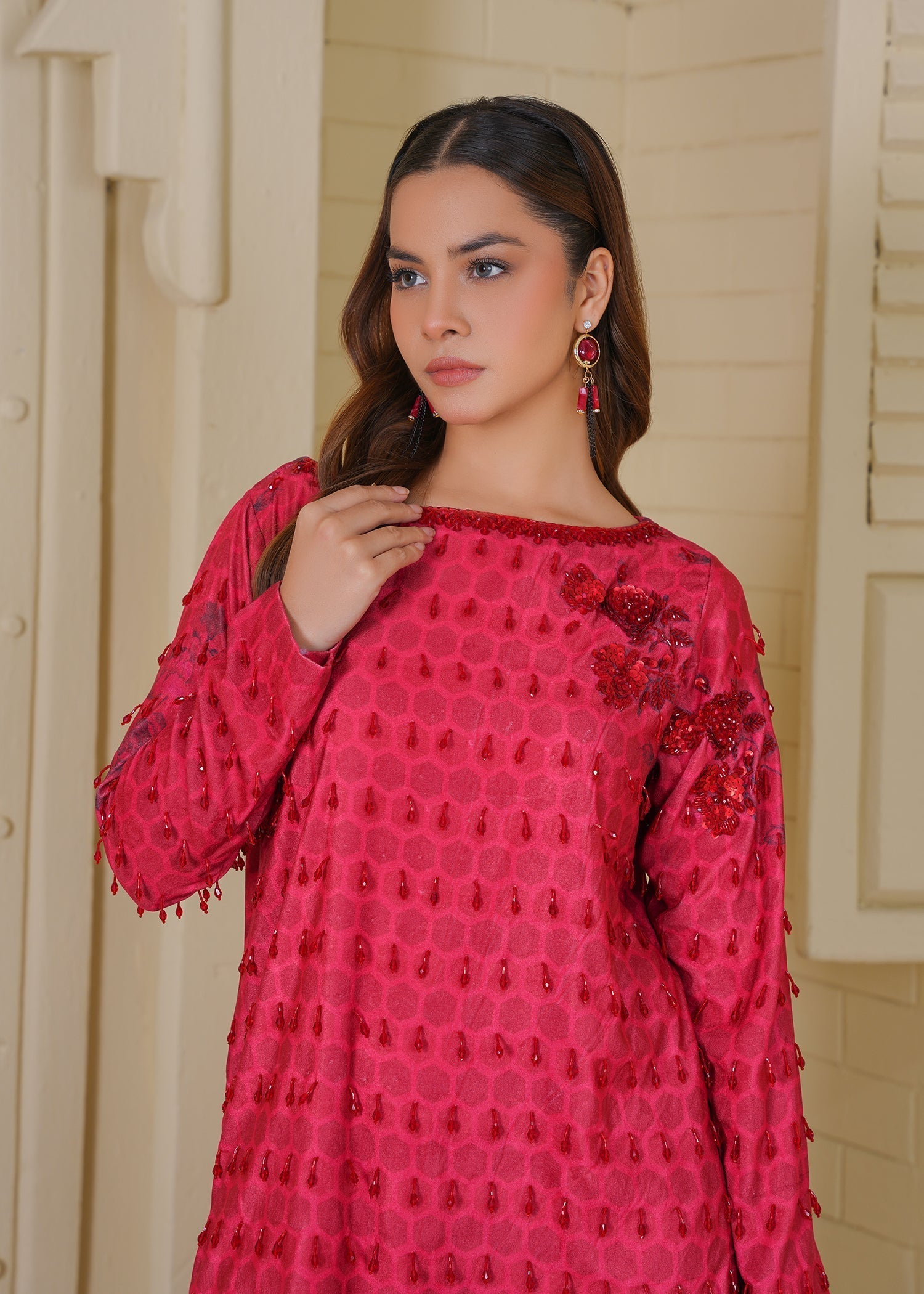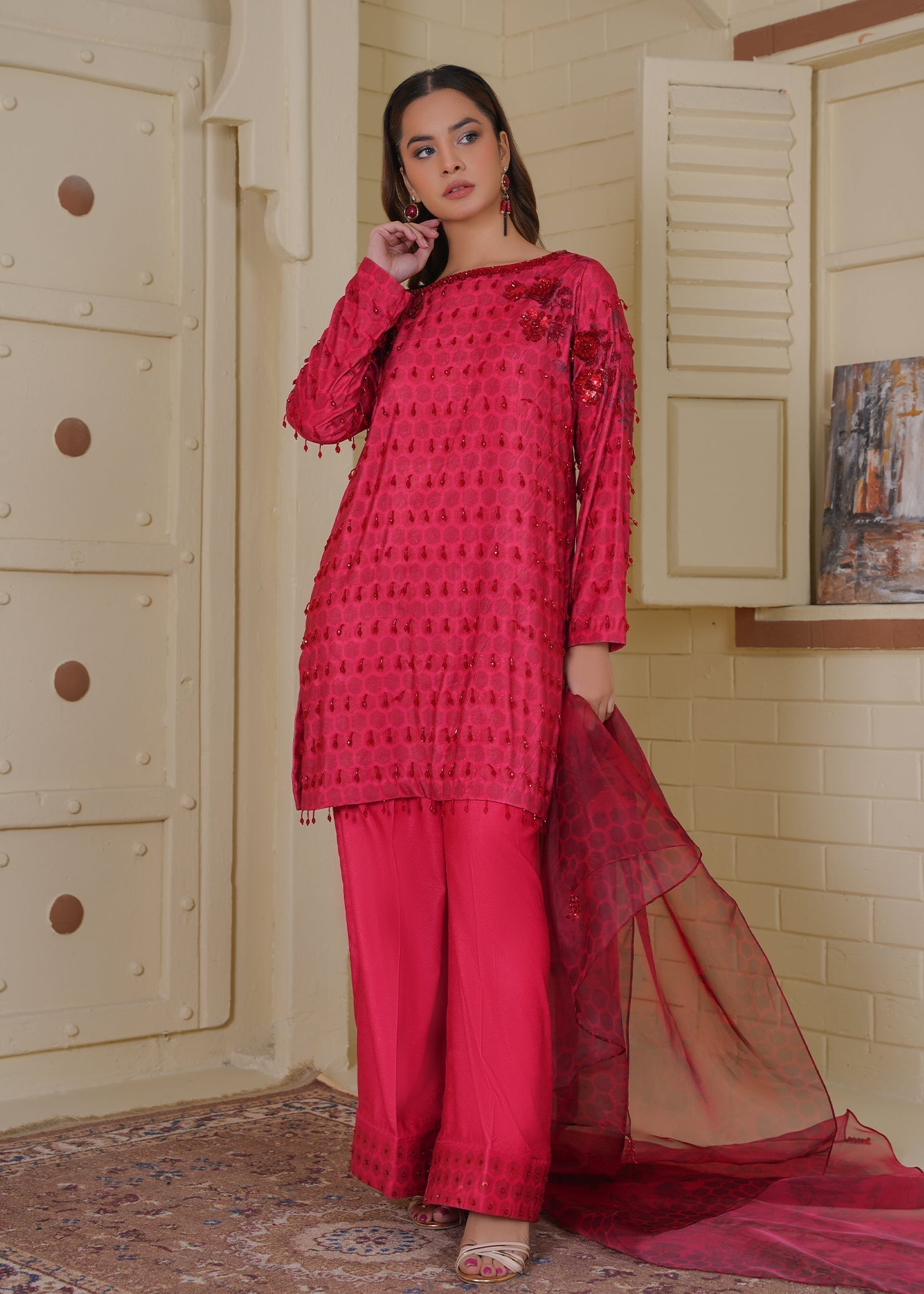 Ruby Velvet Ensemble: A rich ruby velvet dress paired with an ethereal organza dupatta, adorned with delicate tassels and intricate embellishments. The luxurious fabric and fine details exude timeless elegance and grace, perfect for refined occasions.