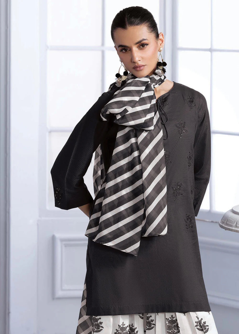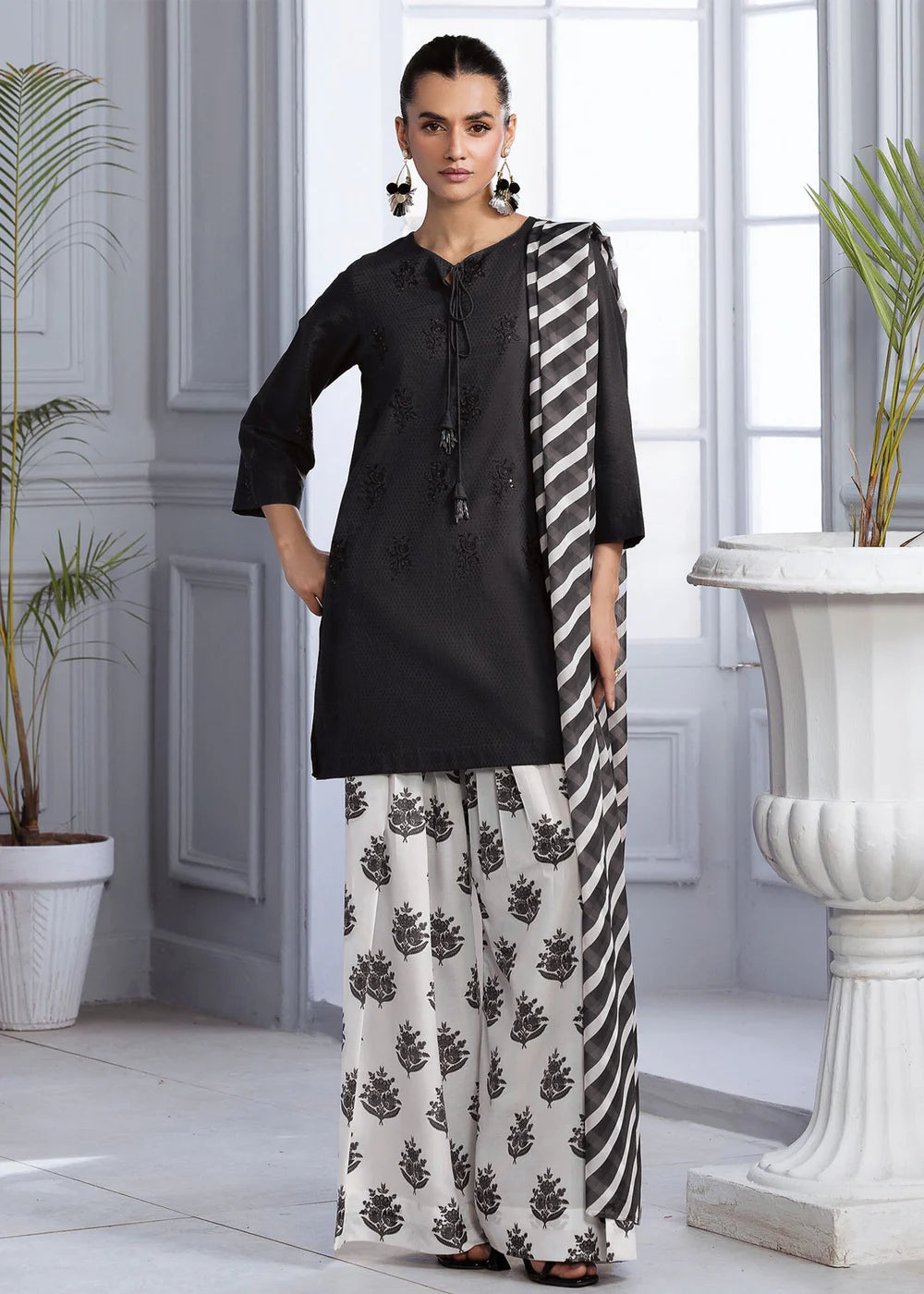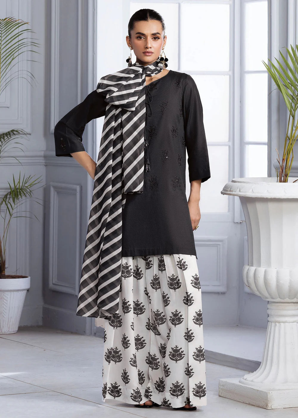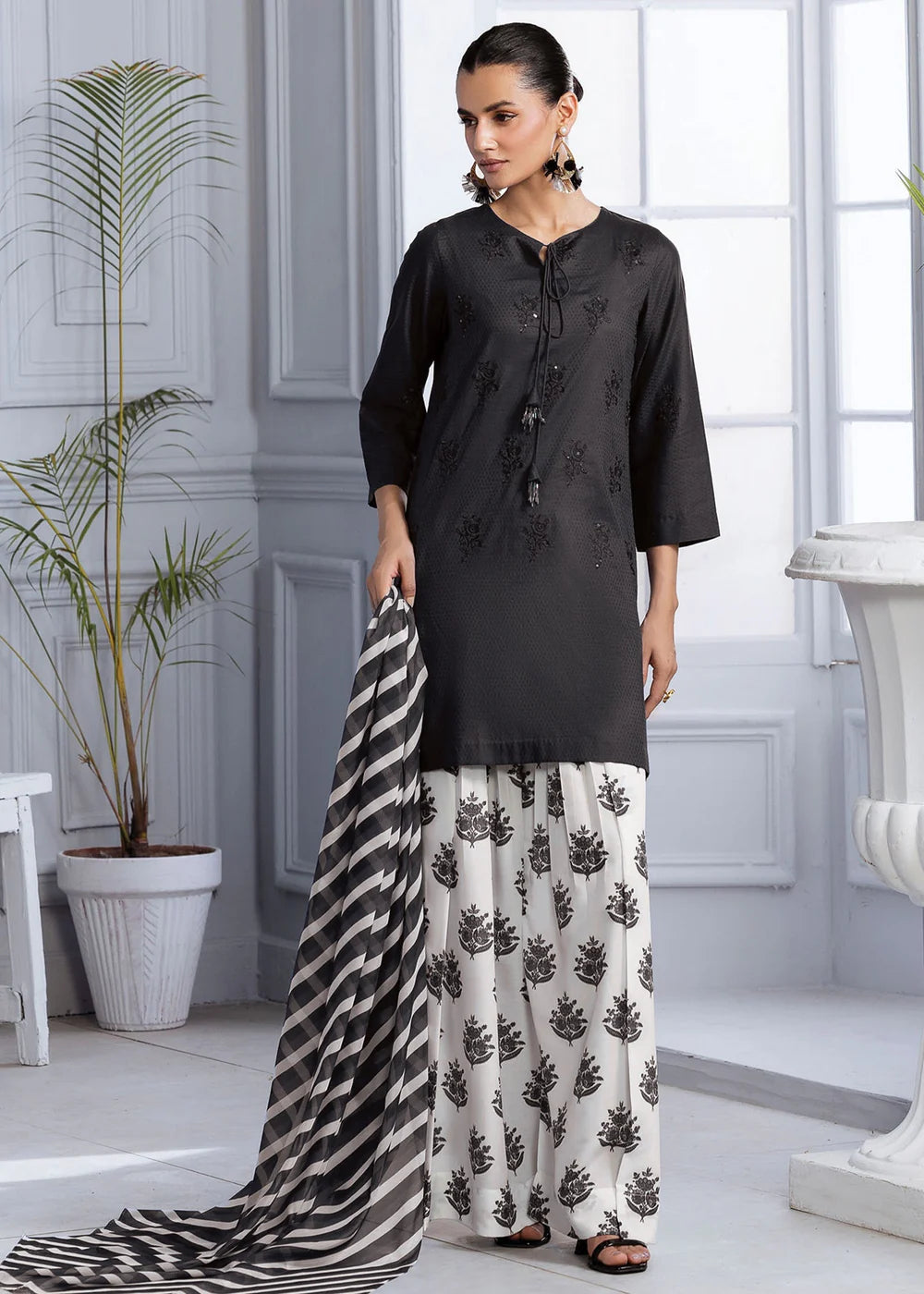 Selina features a lawn shirt beautifully detailed with an embroidered motif, paired with a printed silk lawn farshi shalwar that adds graceful volume. A matching silk dupatta completes the look with fluid elegance. A perfect fusion of refined tradition and contemporary charm, ideal for festive days or elevated everyday style.