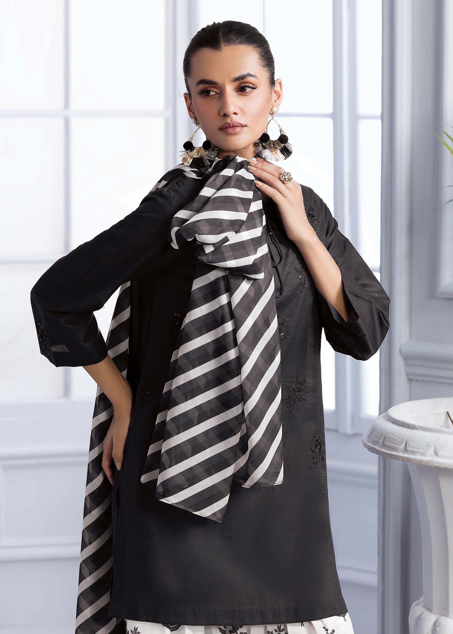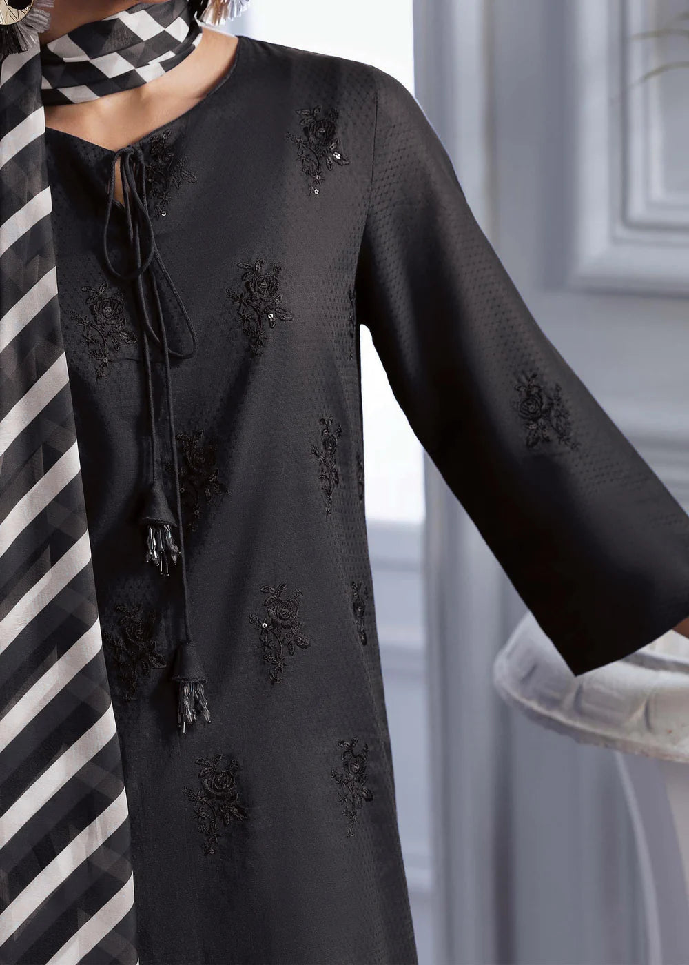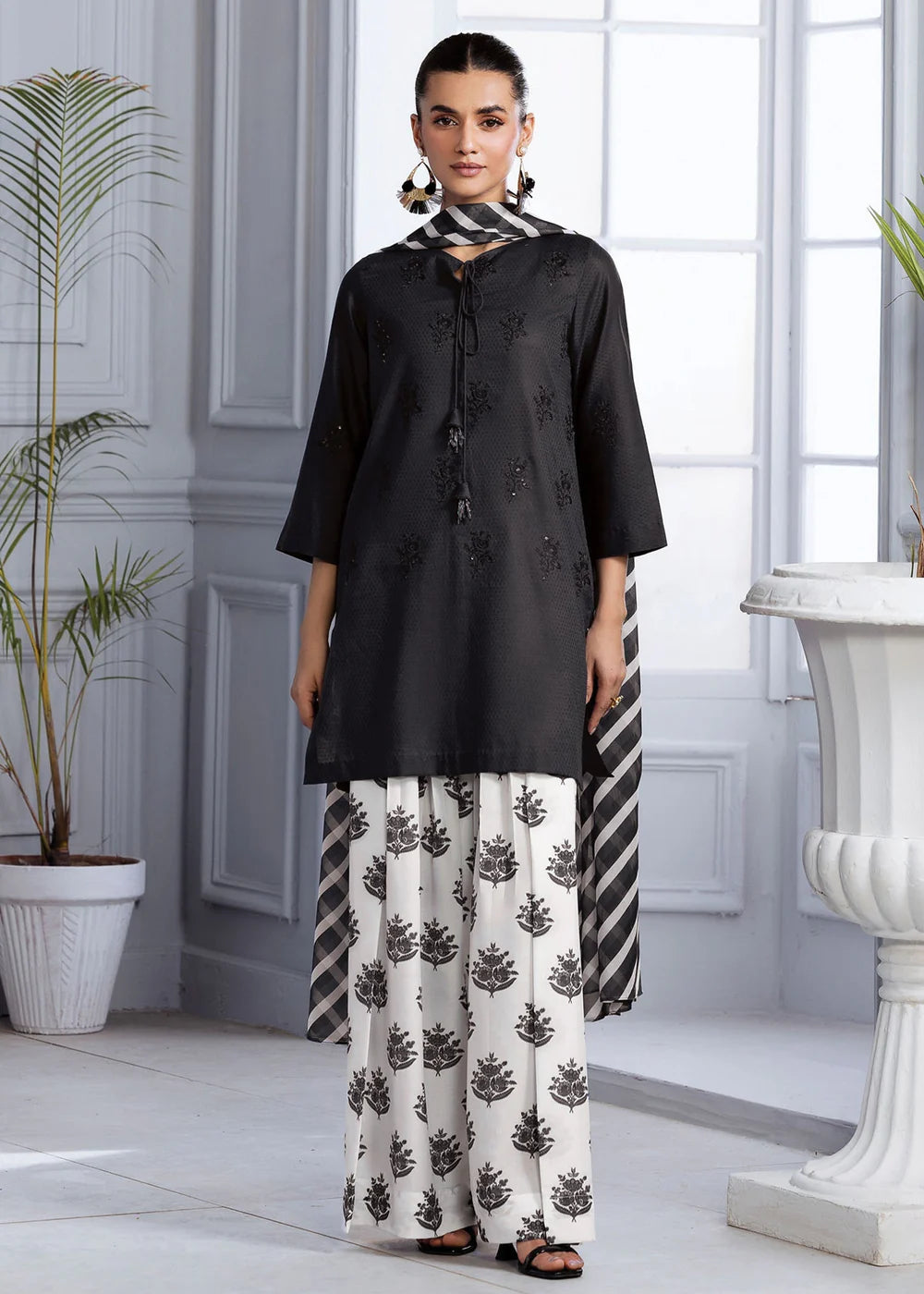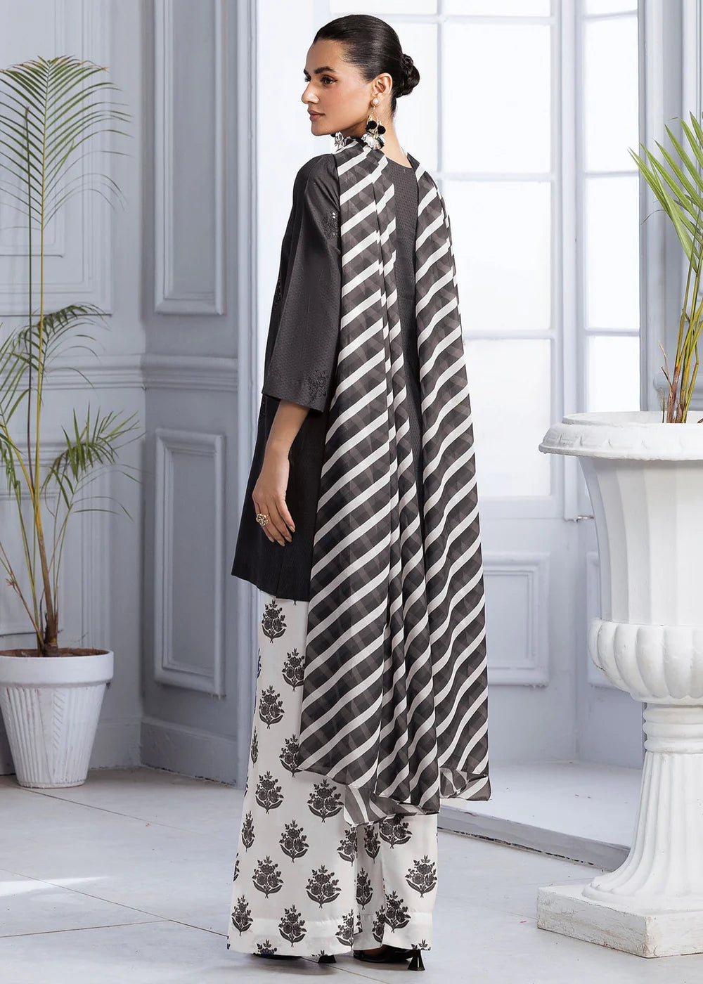 Selina features a lawn shirt beautifully detailed with an embroidered motif, paired with a printed silk lawn farshi shalwar that adds graceful volume. A matching silk dupatta completes the look with fluid elegance. A perfect fusion of refined tradition and contemporary charm, ideal for festive days or elevated everyday style.